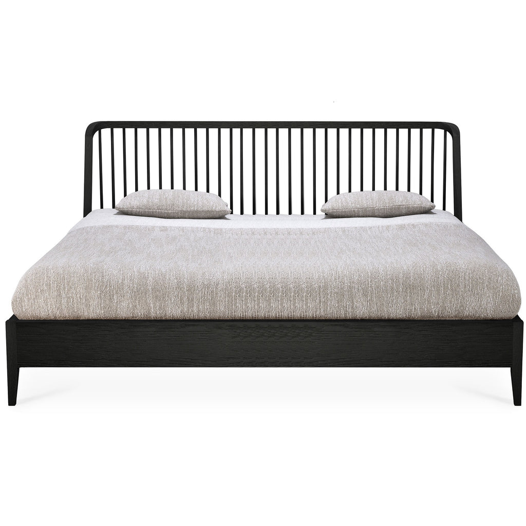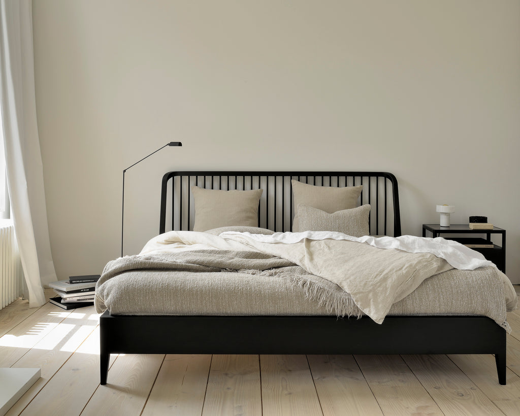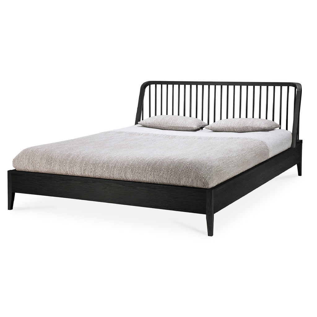 The Spindle collection found its inspiration in the traditional spinning wheel and incorporates perfectly aligned spokes into the headboard. Slightly tapered legs and rounded edges add a soft, sensual quality to this beautiful bedroom collection. Made from black tainted oak with a varnish finish.