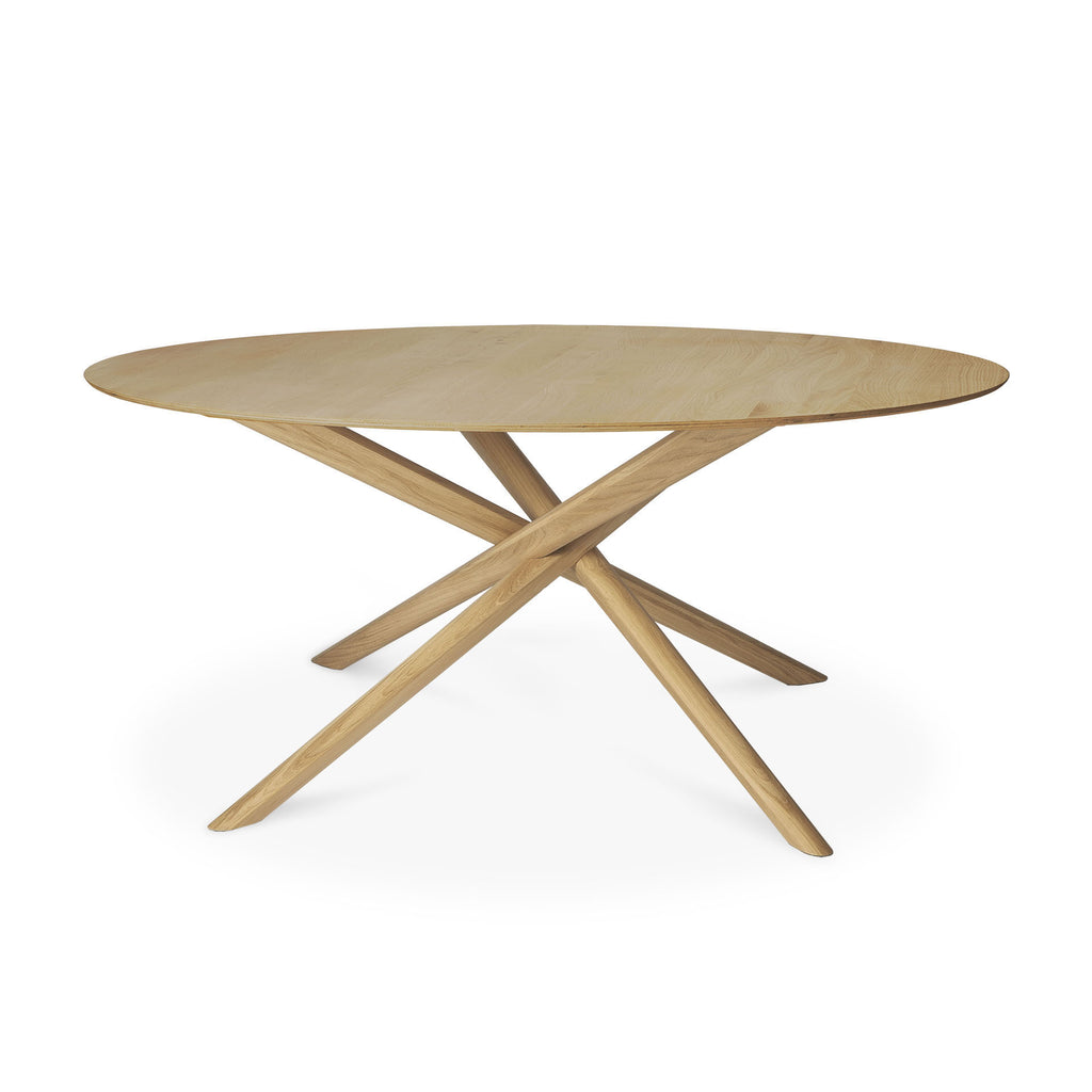 The Mikado dining table, designed by Alain van Havre, has been one of our most recognizable designs for years. For its round version, we kept the same eye-catching construction but aimed for a visually lighter design. In an exercise of balance and stability, the legs are thinner and more refined with round edges to fit the solid oak dining table's new shape. Made from solid oak with a hard-wax oil finish.