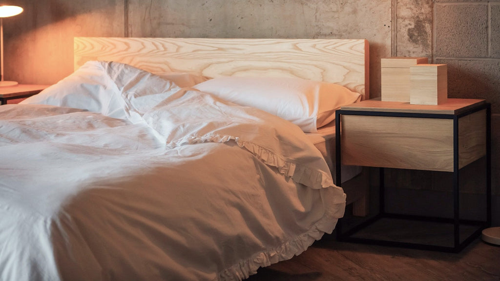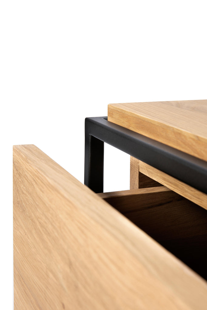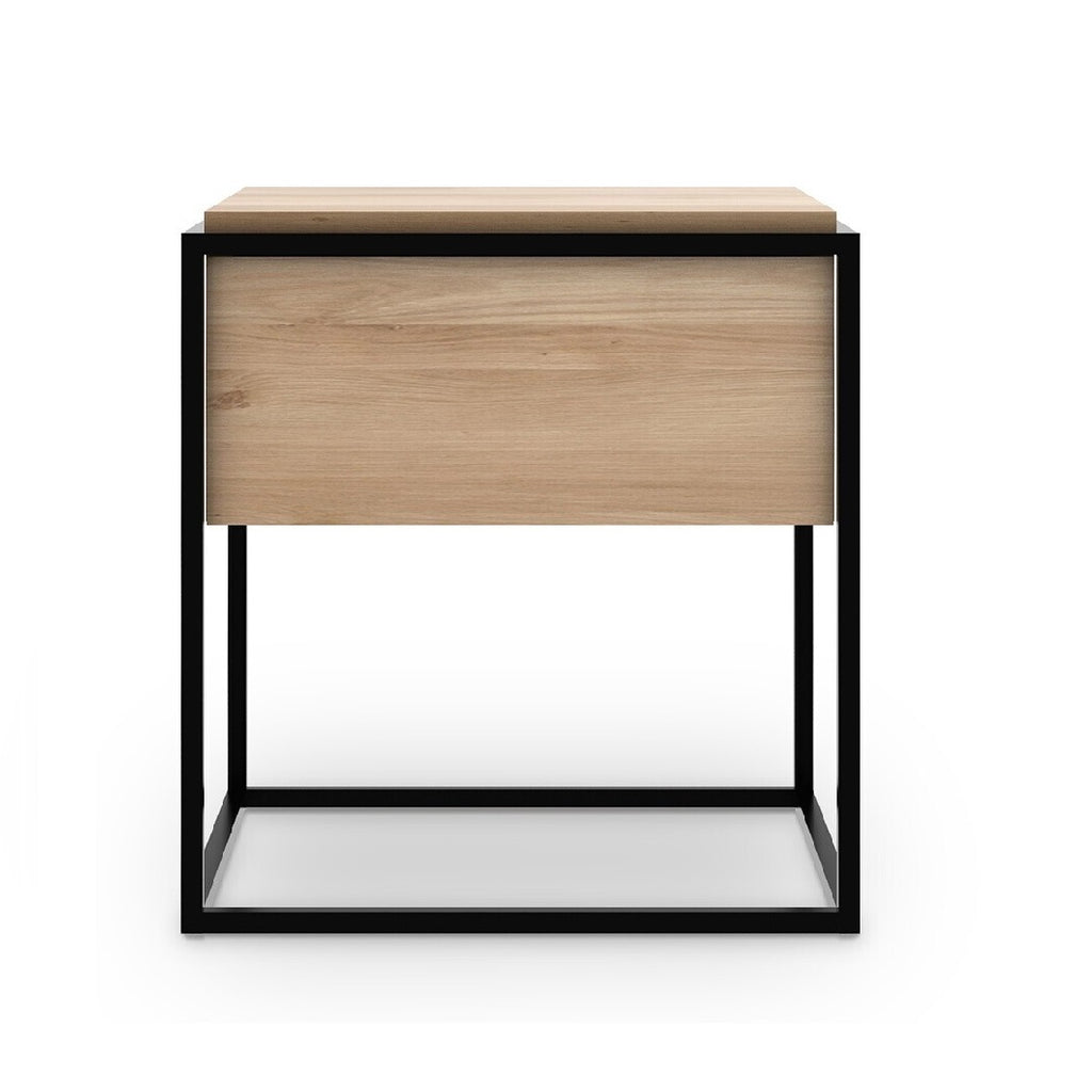 The Monolit bedside table features 1 push-open drawer. Practicality without sacrificing style. The minimalistic Monolit bedside table in solid oak offers ample storage and serves as a convenient stand for bedside essentials. Made from solid oak with a hard-wax oil finish and a black metal frame.