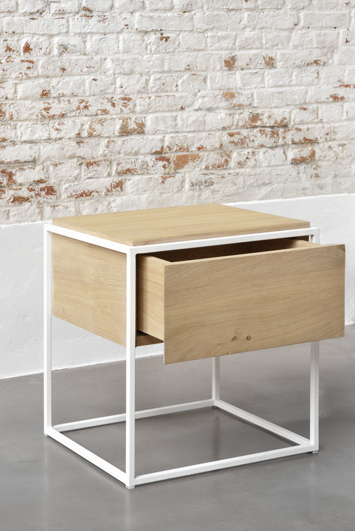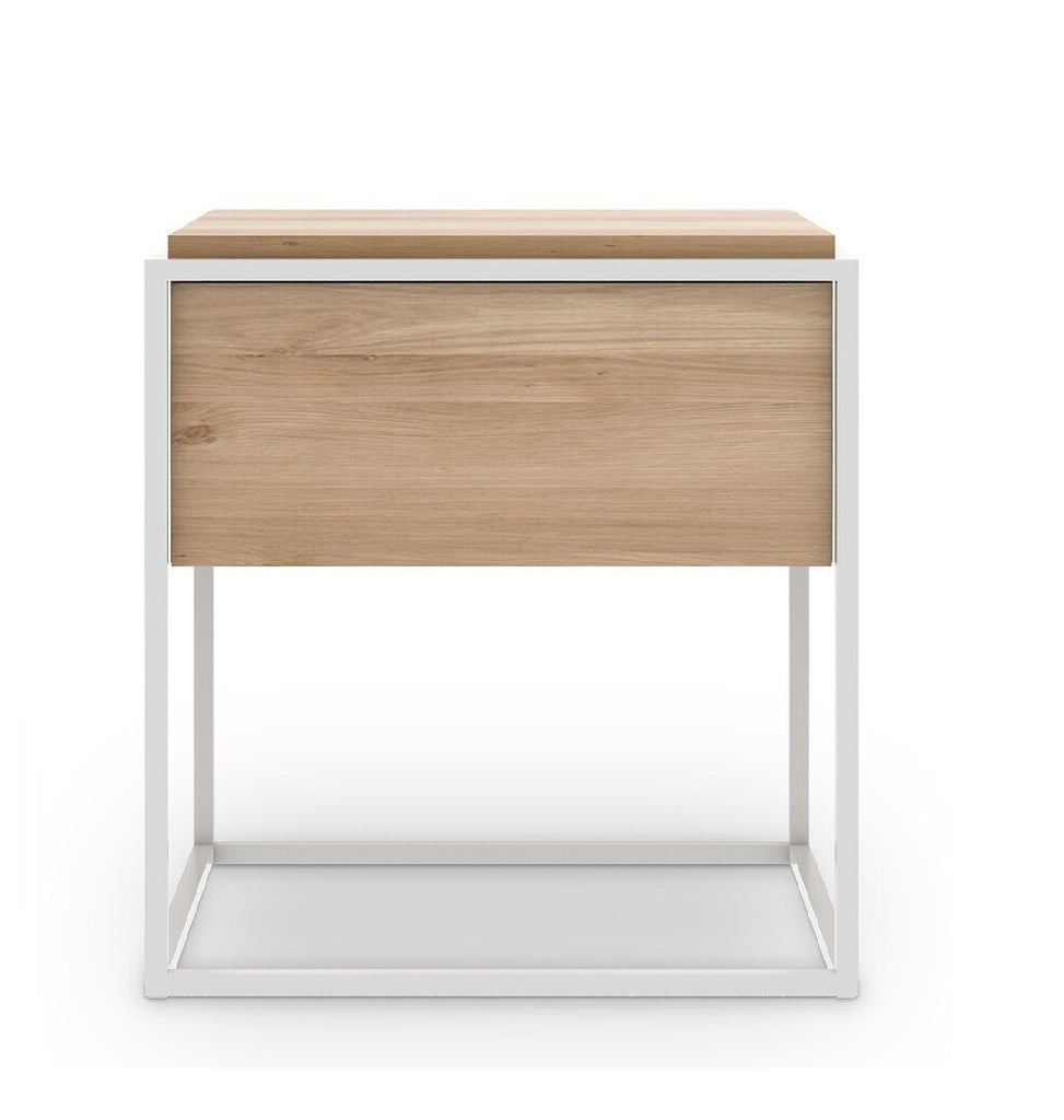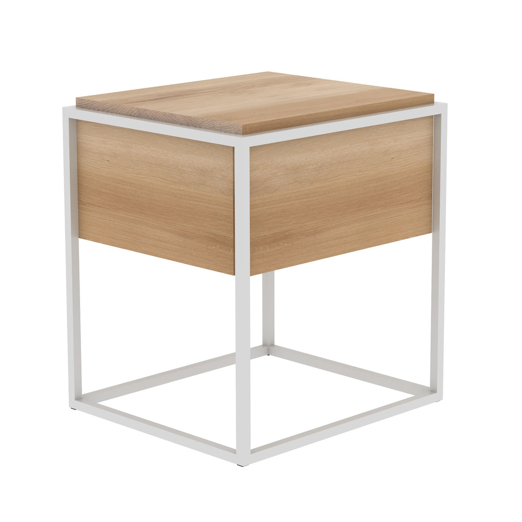 The Monolit bedside table features 1 push-open drawer. Practicality without sacrificing style. The minimalistic Monolit bedside table in solid oak offers ample storage and serves as a convenient stand for bedside essentials. Made from solid oak with a hard-wax oil finish and a white metal frame.