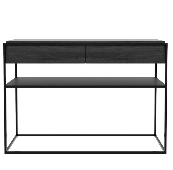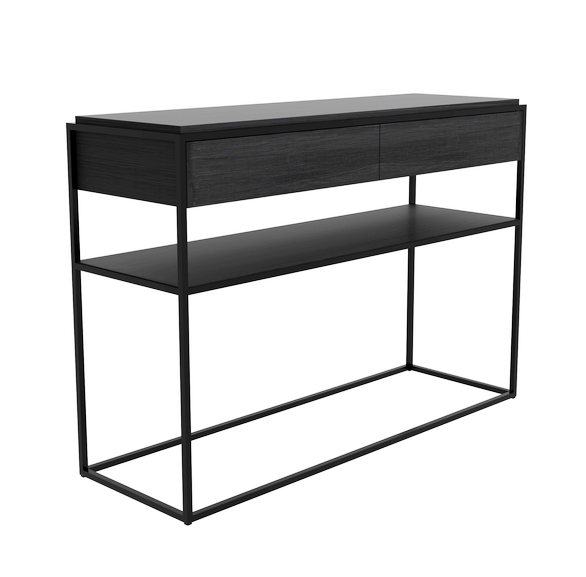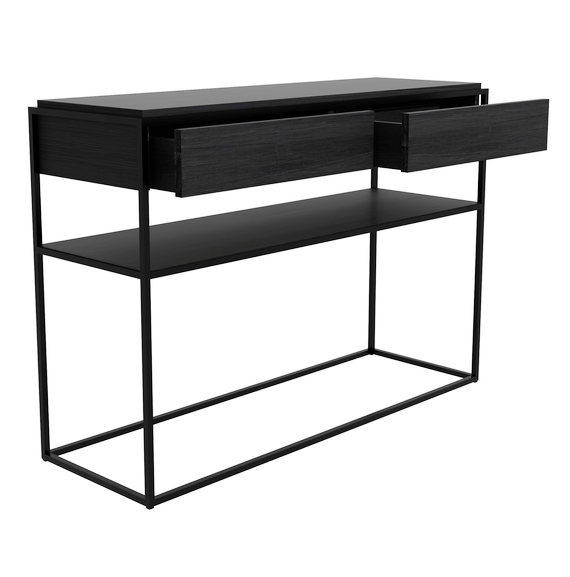 The Monolit console features 2 drawers. Balance and function come together in the Monolit console It attracts attention without diverting it from the object you choose to display. Made from black tainted solid oak with a varnish finish and a black metal frame.