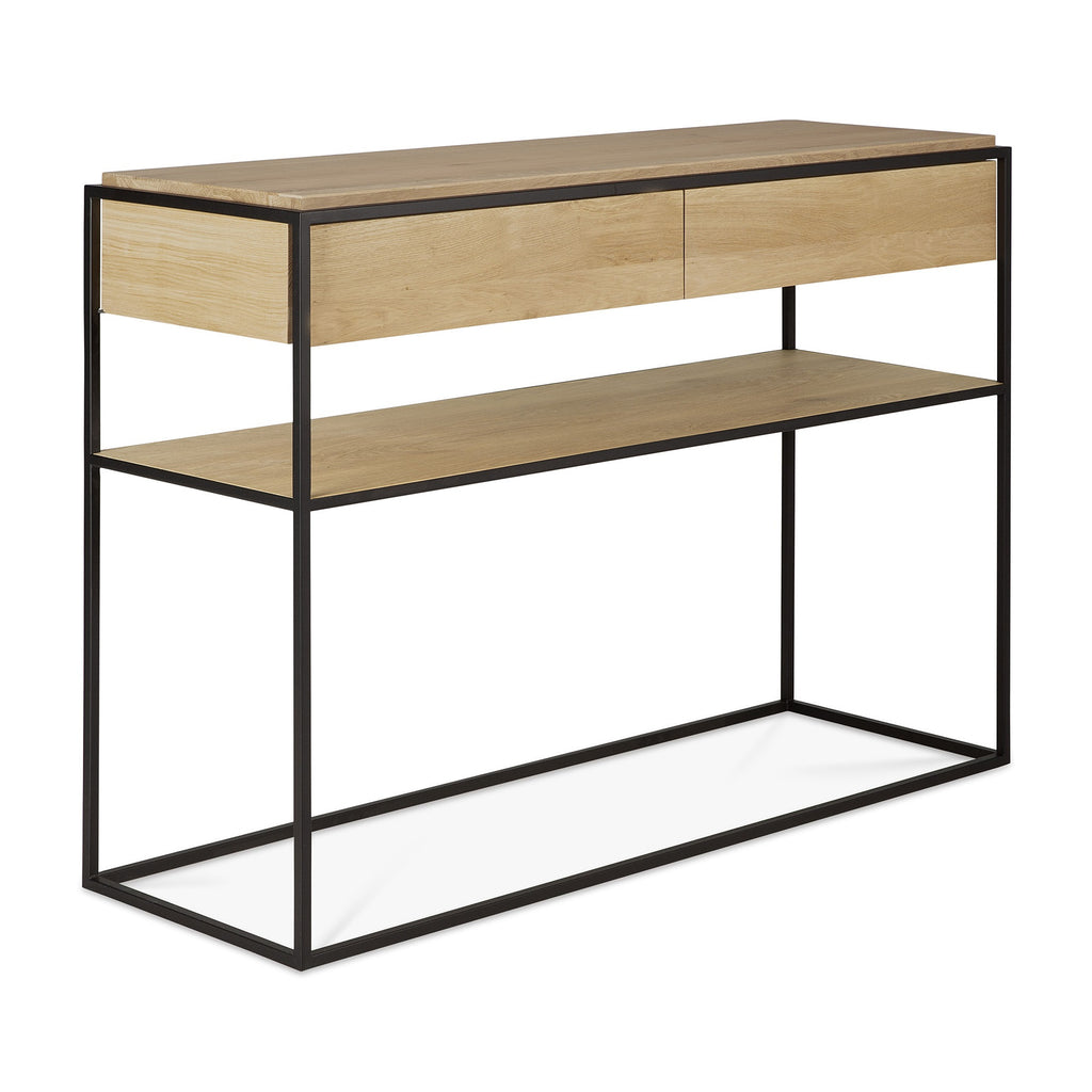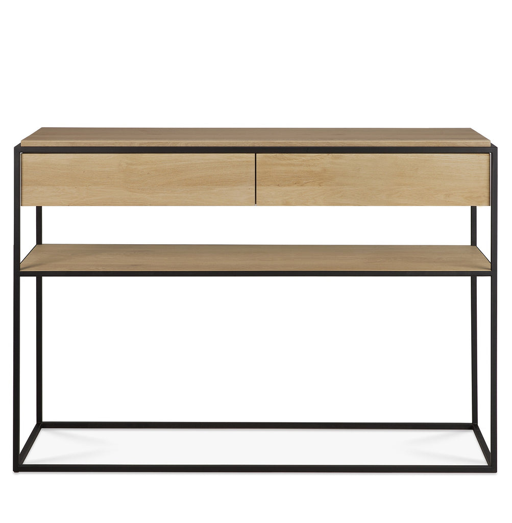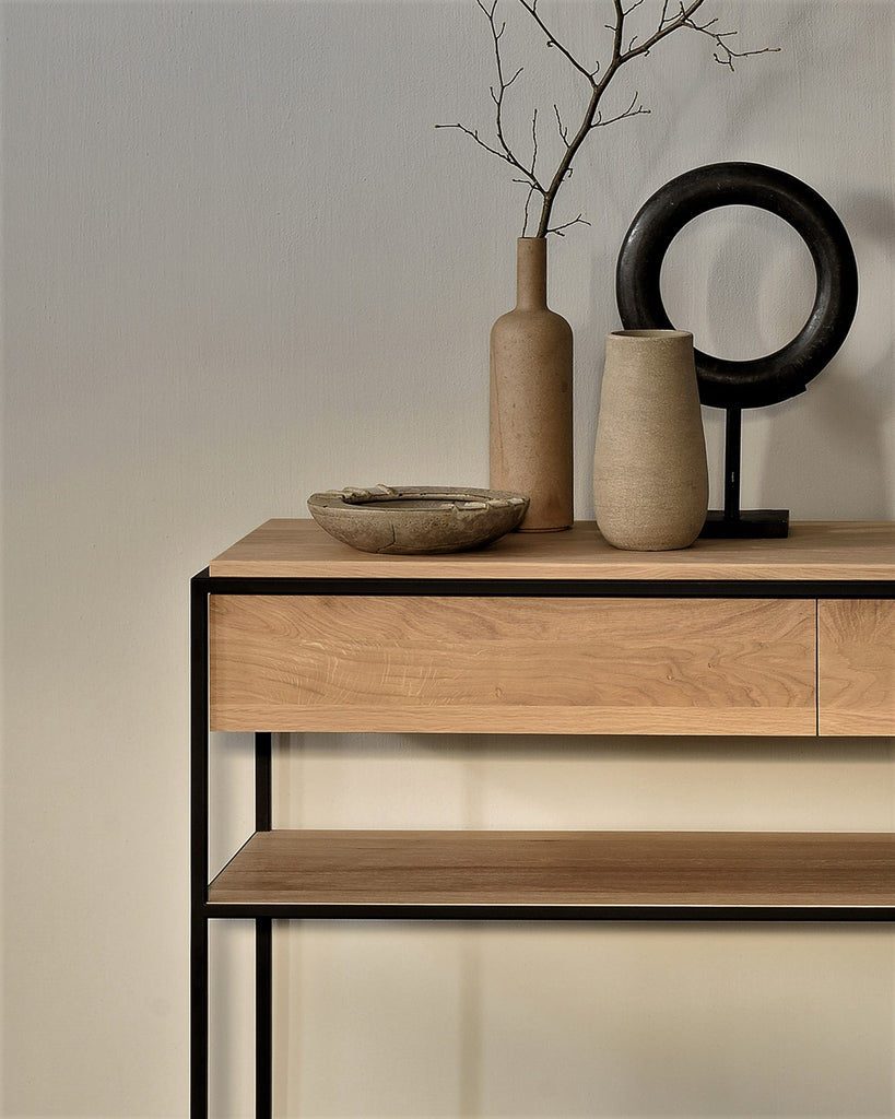 The Monolit console features 2 drawers. Balance and function come together in the Monolit console It attracts attention without diverting it from the object you choose to display. Made from solid oak with a hard-wax oil finish and a black metal frame.