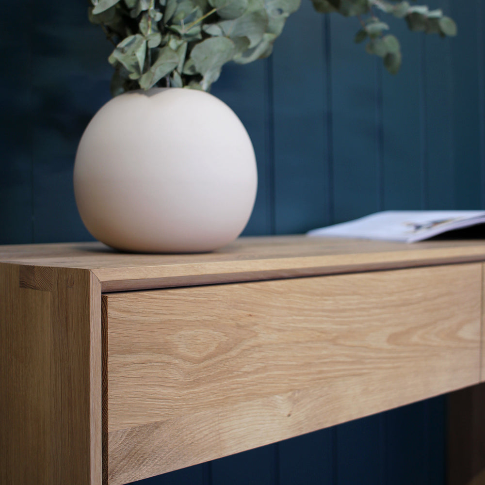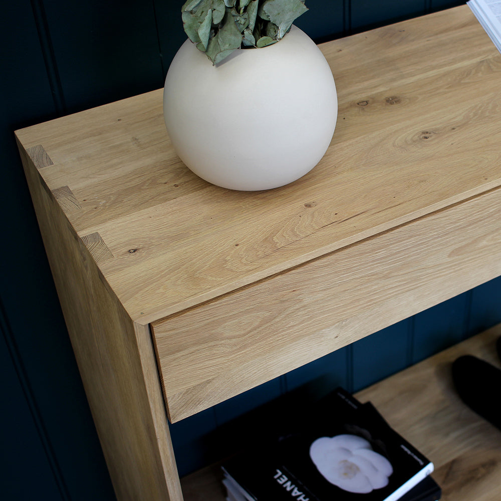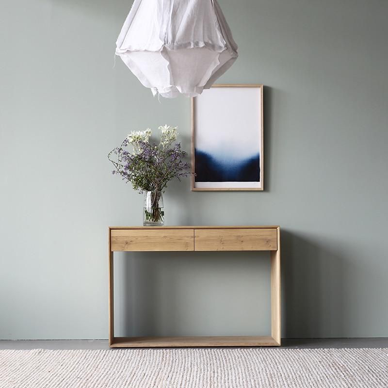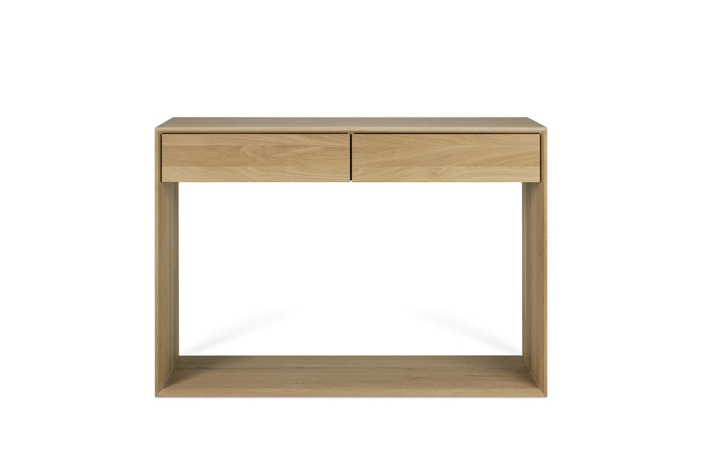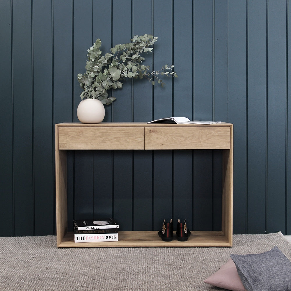 The Oak Nordic console features 2 soft-closing drawers. The Nordic collection combines refined design with the purity of solid wood. The beveled edges gives this solid oak furniture an extra edge. Made from solid oak with a hard-wax oil finish.