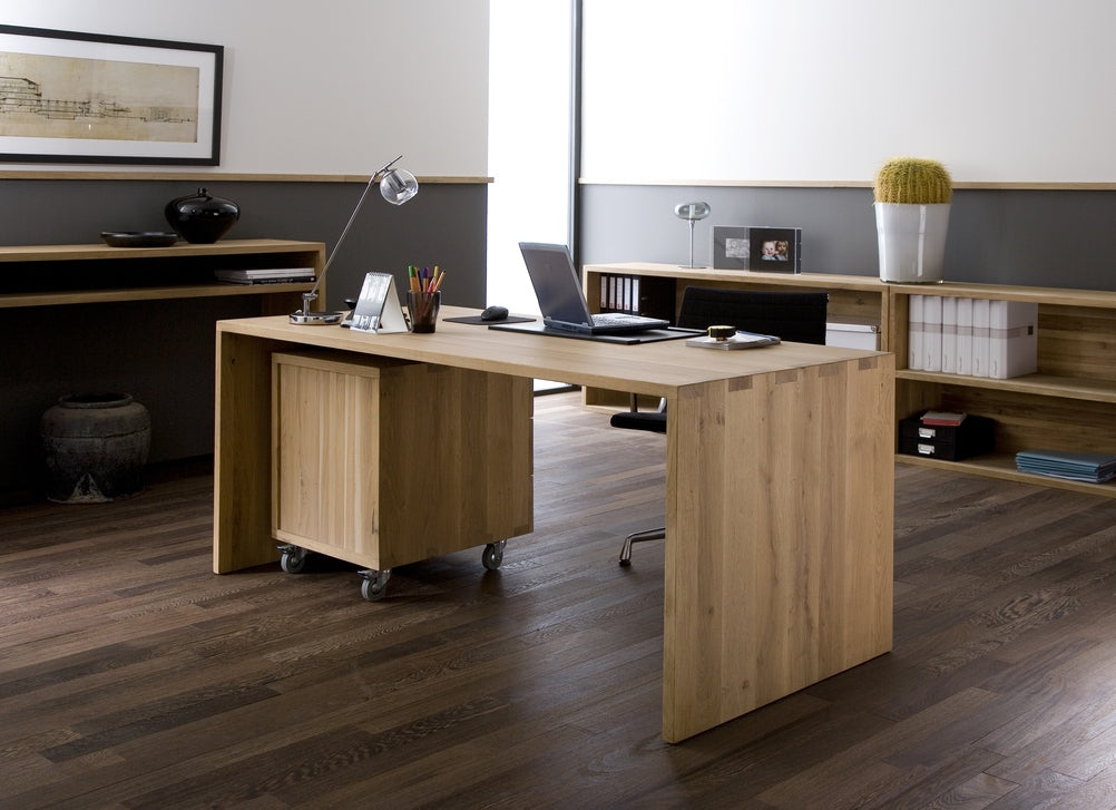 Create your own office corner with the elegant U desk and give yourself the space you need to spur your creativity. This Ethnicraft Oak Office U Table, crafted from solid European Oak, features a sleek, contemporary and minimalist waterfall edge work table. Complete it with Ethnicraft Oak Office Billy office pedestal.