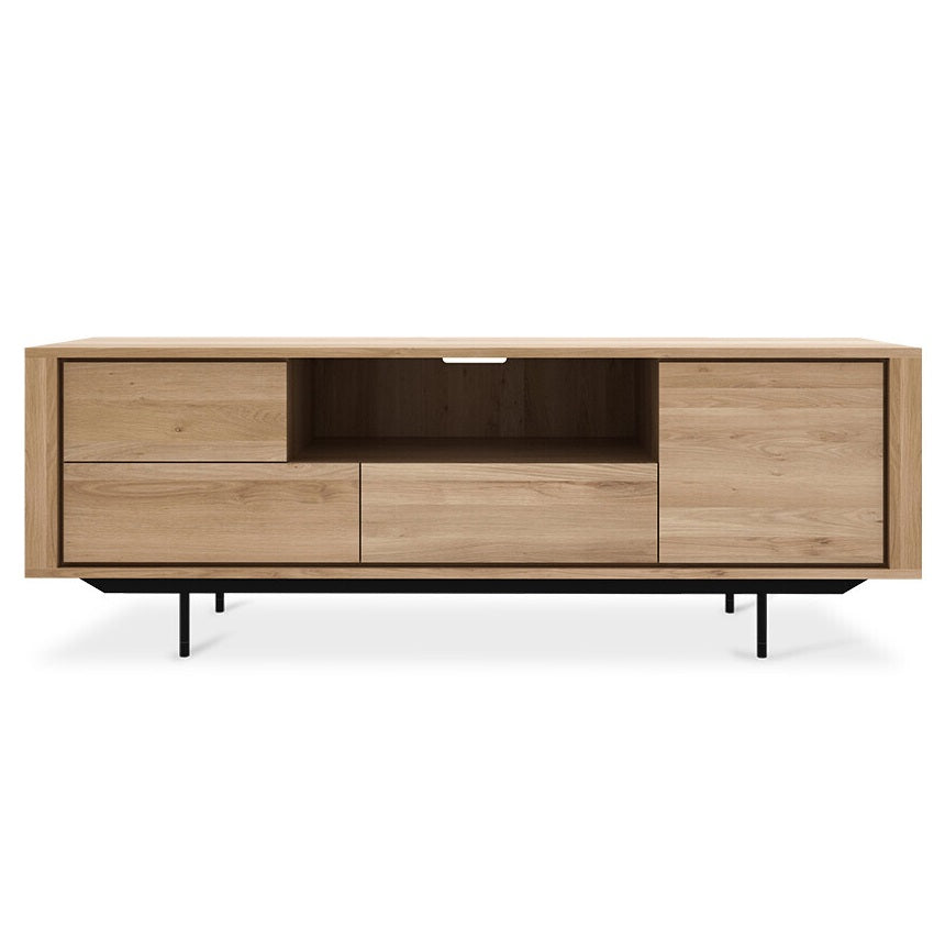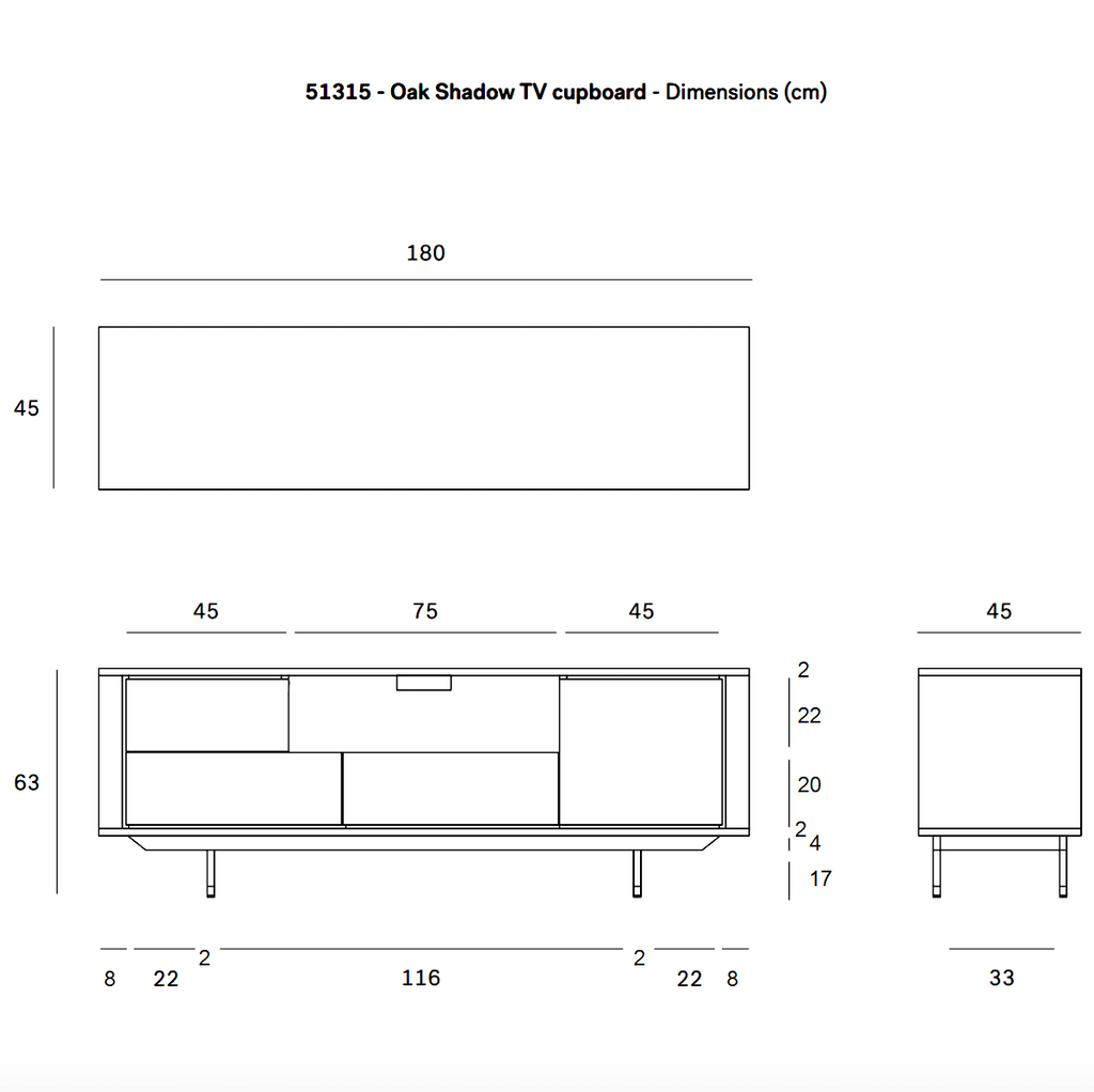 The Shadow TV cupboard features 1 door, 1 flip-down door and 2 drawers. Straightforward and robust with decisive lines, the Shadow TV cupboard in solid oak is a simple yet impressive solution to your storage needs. Made from solid oak with a hard-wax oil finish and black metal legs.