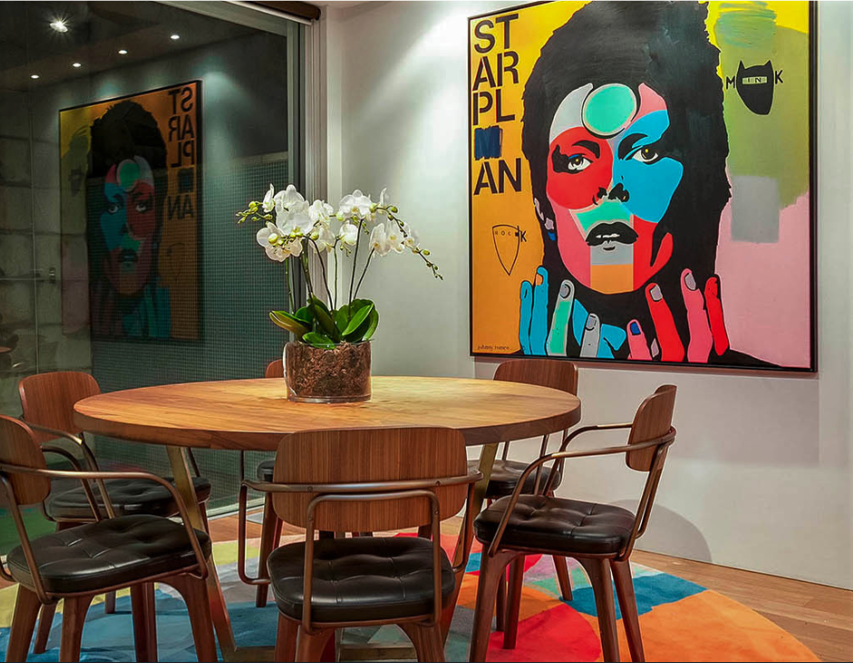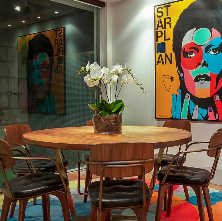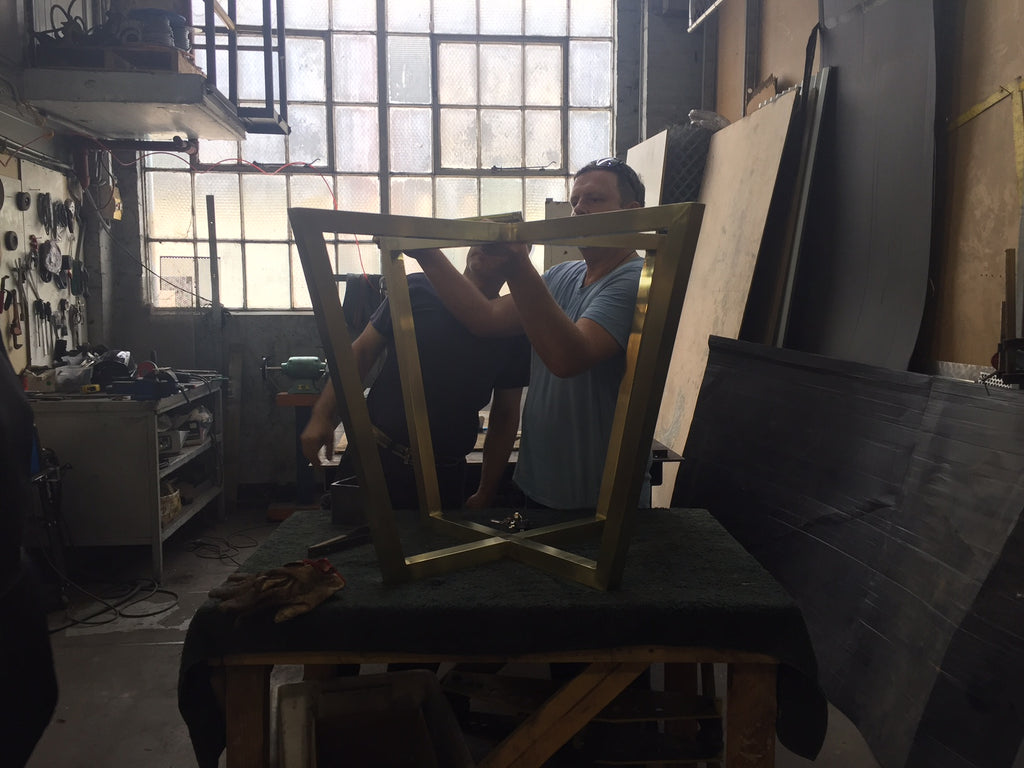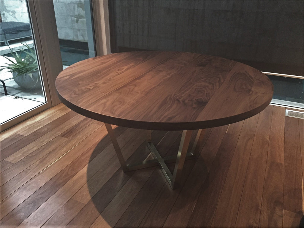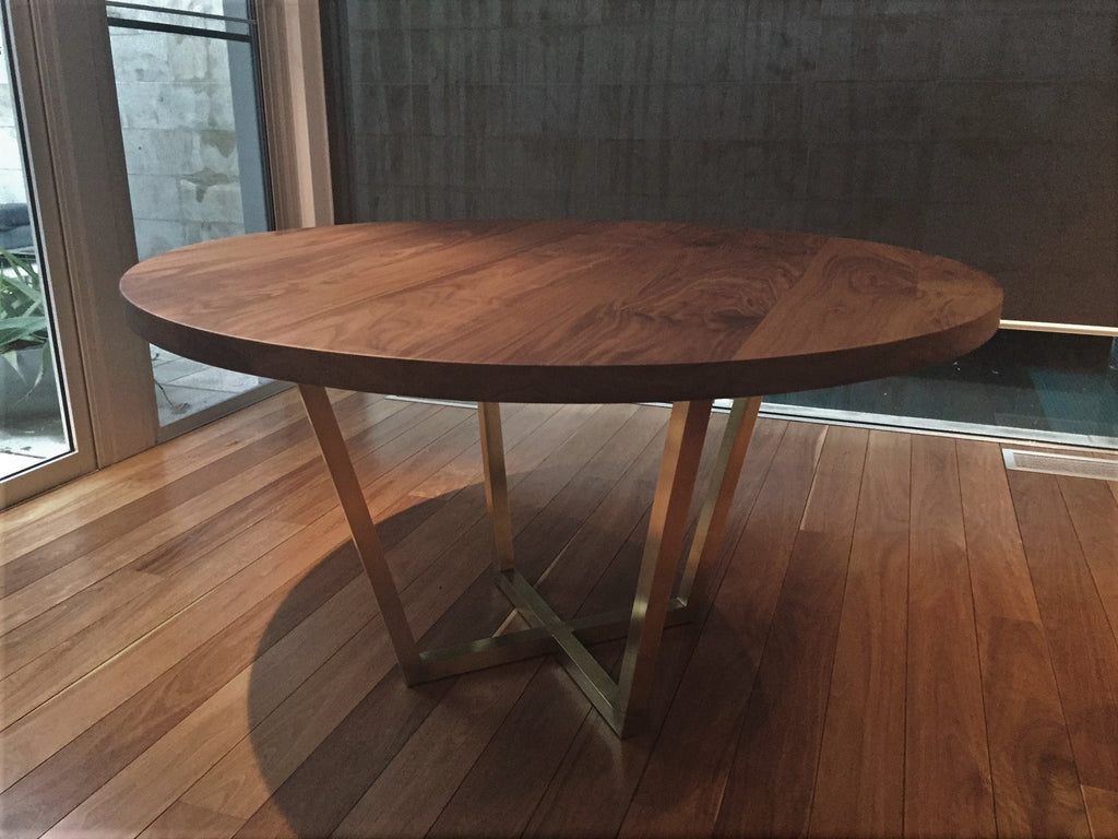 The Cosmo Table has a solid timber top with a tulip-shaped brass leg-structure. The design of this table combines modern communal dining with an old-world luxury feel of its noble components. This table will allow most dining chairs with arms to fit under the tabletop. Available in a variety of local and imported timbers and color-tones. Made in Sydney to clients' requested sizes and shapes.