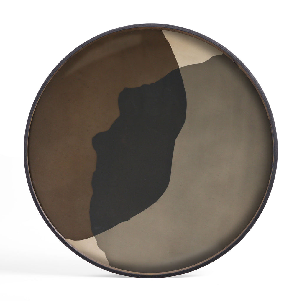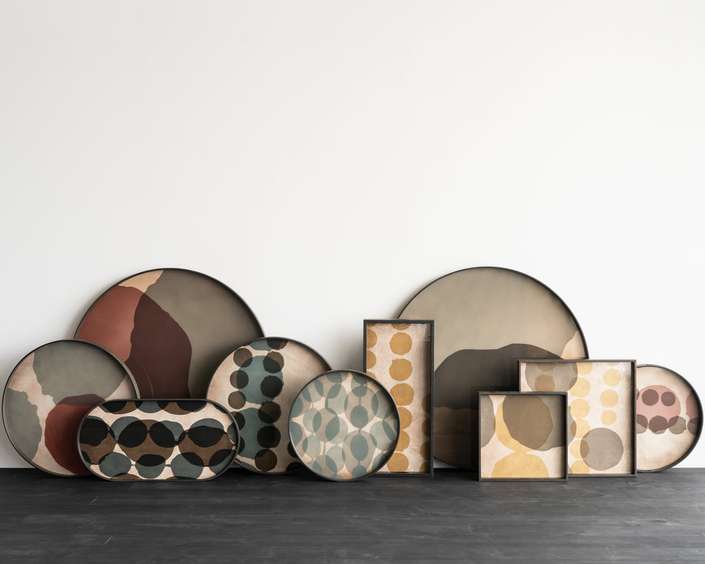 The Translucent Silhouettes collection of trays artfully layers organic dots atop an aged surface, creating a sense of depth and allowing dynamic combinations to blossom. While the overall result is bold, the collection possesses certain lightness conveyed by the delicate inks and pigments. Hand painted base - silk-screen printed glass - wooden rim.