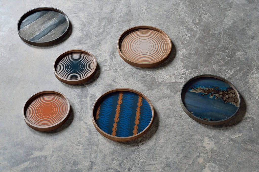 Organic movement meets linear shapes in the Linear Flow tray collection. This Slate Organic glass valet tray is inspired by the ink drawings at the beginning of the design process, when the pigment hits the glass it takes on a remarkable life of its own. Complementary effects are revealed in unexpected ways, where hand sketched and painted linear patterns generate a truly distinctive finish. Hand painted glass - wooden rim.