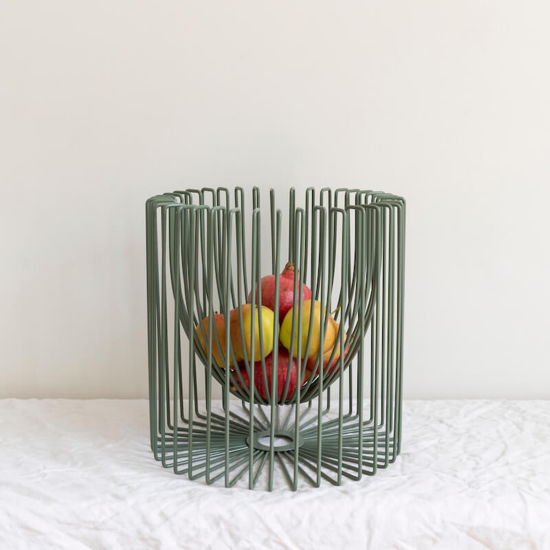 The simple, clean lines of this Sage coloured steel wire fruit bowl make it a stylish yet versatile piece. Designed to be incorporated into many different styles of interior, (Scandinavian, Danish, Mid Century Modern, Vintage Industrial, architecturally designed, etc.) It is equally as beautiful when used as a plant holder. Each wire fruit bowls has been shaped and moulded using a traditional handcrafted method. Each wire is bent then spot welded, creating an inner bowl that allows your fruit to float mid-air.