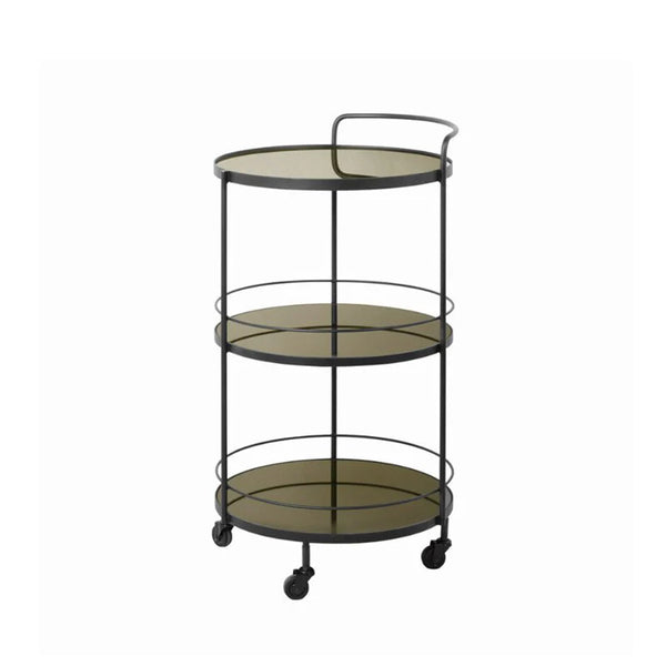 Ethnicraft Lucy Round Black Metal Bar Cart - 3 Bronze Mirror Shelves Ø49/H93cm