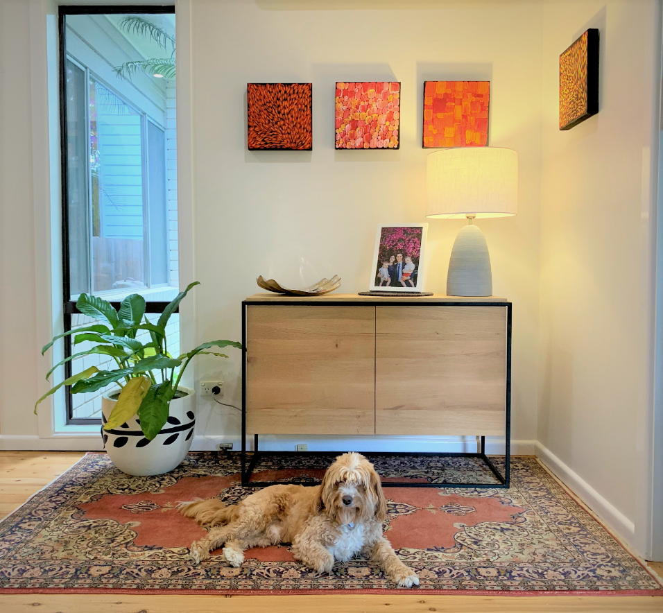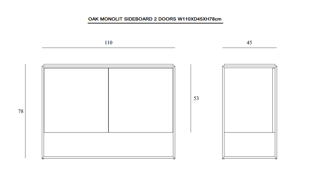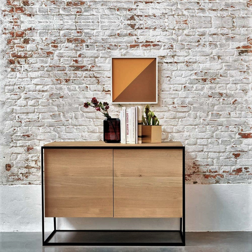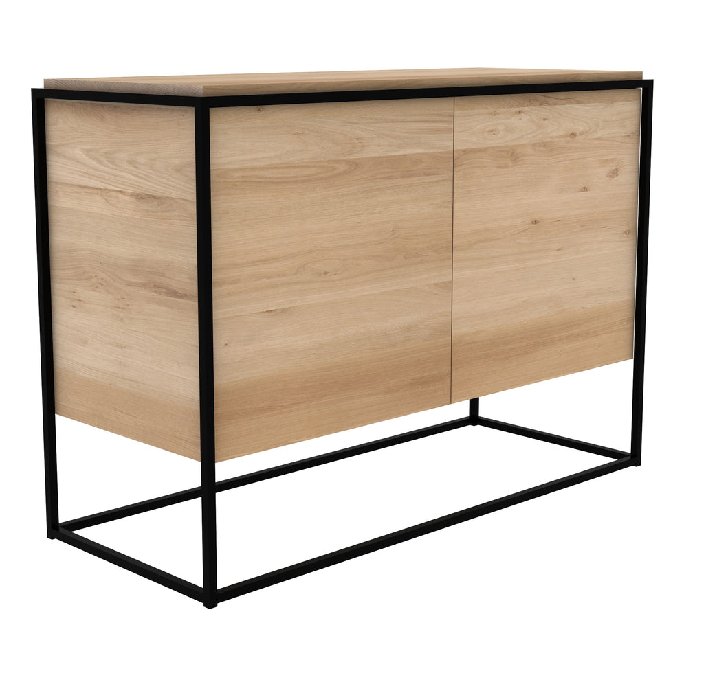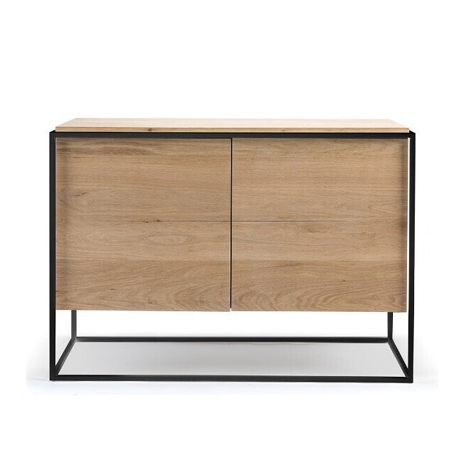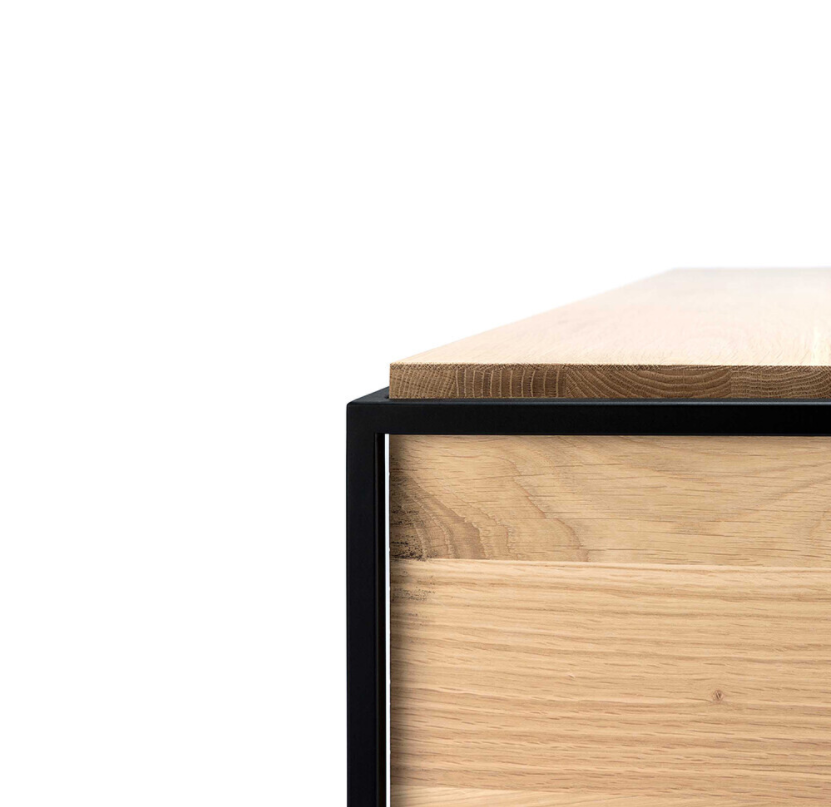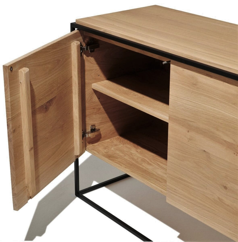 The Monolit sideboard features 2 push open doors. Practicality without sacrificing style. The contrasting characteristics of wood and the rectangular metal frame of the Monolit sideboard create a unique backdrop for all modern media equipment. Made from solid oak with a hard-wax oil finish and a black metal frame.