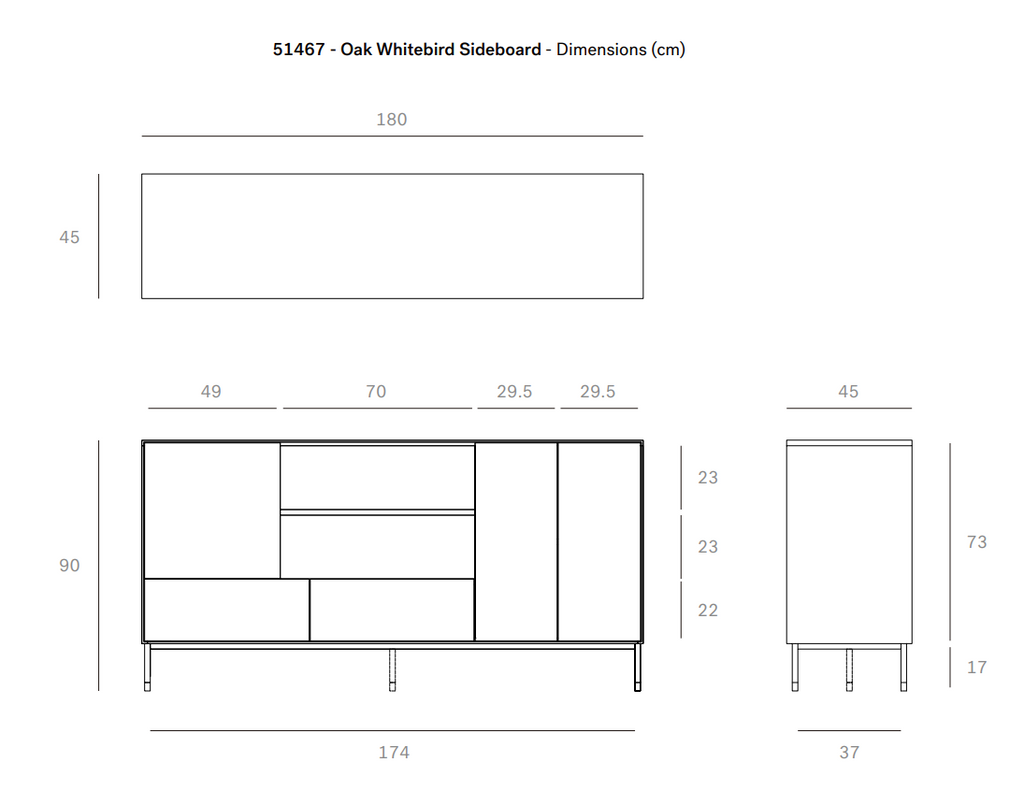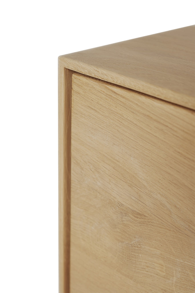 This Whitebird sideboard features 3 push open doors and 2 push open drawers. For the Whitebird collection, designer Alain van Havre brings together opposing elements, combining soft round legs and eye-catching graphic lines into light and airy designs. Made from solid oak with a varnish finish and black metal legs.