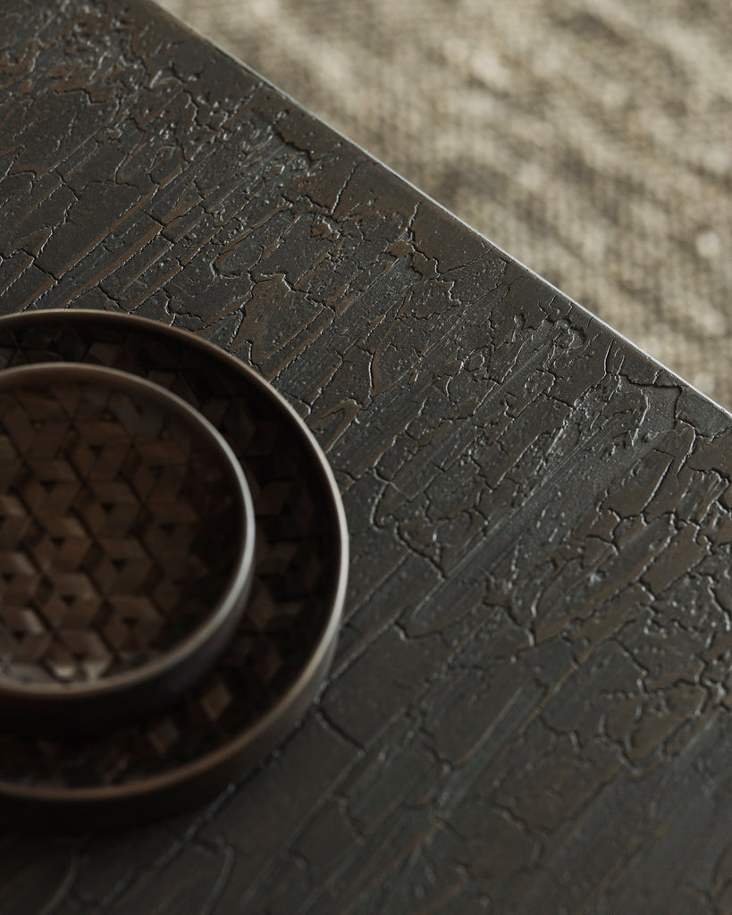 Relying on some of the oldest artistic ancestral techniques, the deep surface of the Stability coffee table is shaped by hand by our skilled artisans. Natural mineral powders and Umber colour pigments blend to form the table’s unique finish. The thickness of the top makes for a revealing contrast with the airy base. Simple lines and a standardised height showcase the clean beauty of well-crafted metal work.