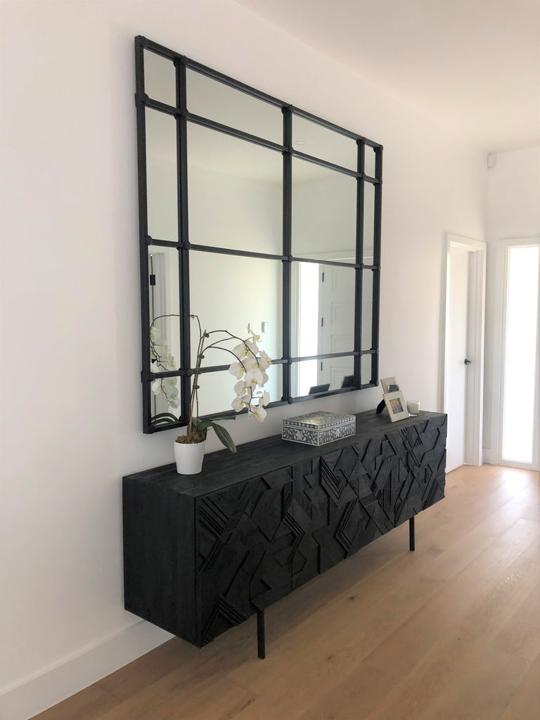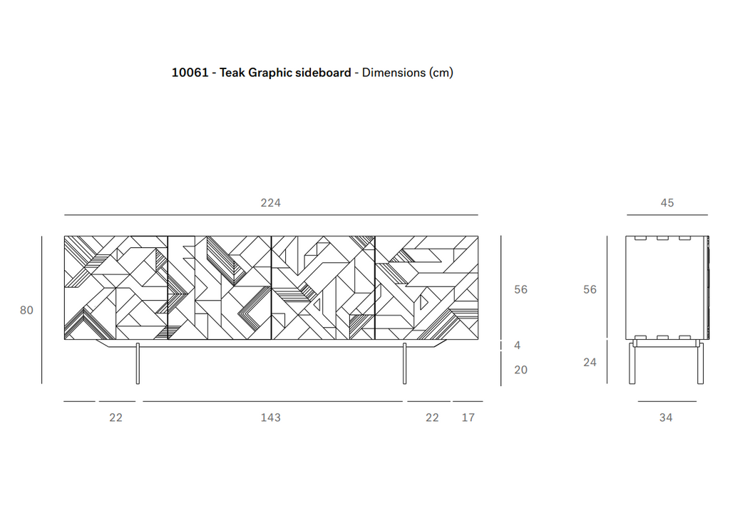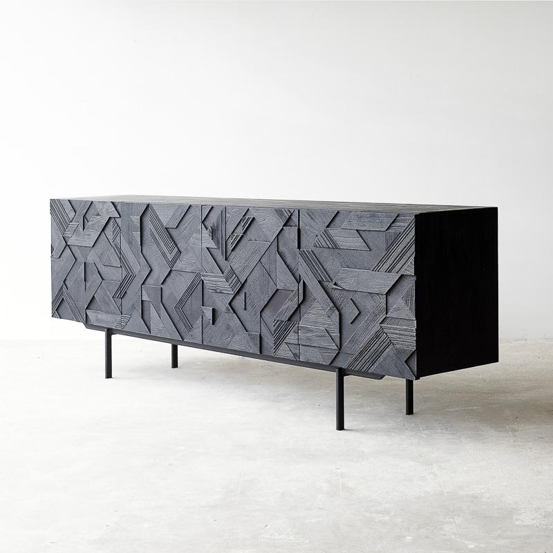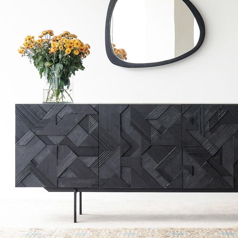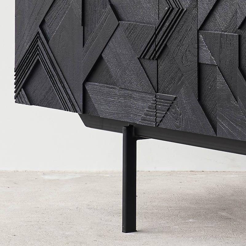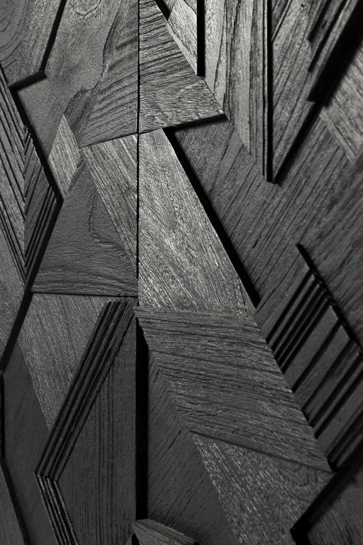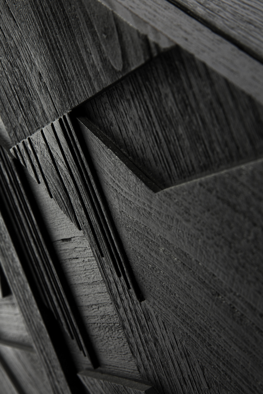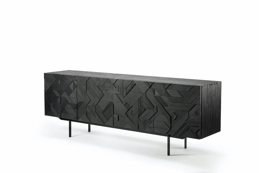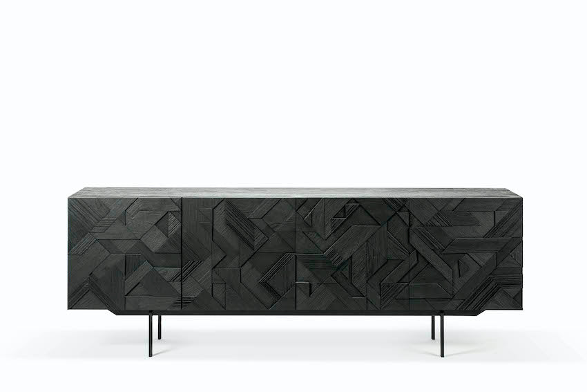 In his quest to add movement to the surface, designer Alain van Havre started layering and combining triangular shapes. Before he knew it he had created a visually enticing composition out of teak and the Graphic design was born. By using multiple layers, a sense of depth and dynamism is created in the intricate arrangement. Motion and warmth are added by further perfecting the natural attributes of wood. Made of black-tainted solid teak with a varnish finish and black metal legs.