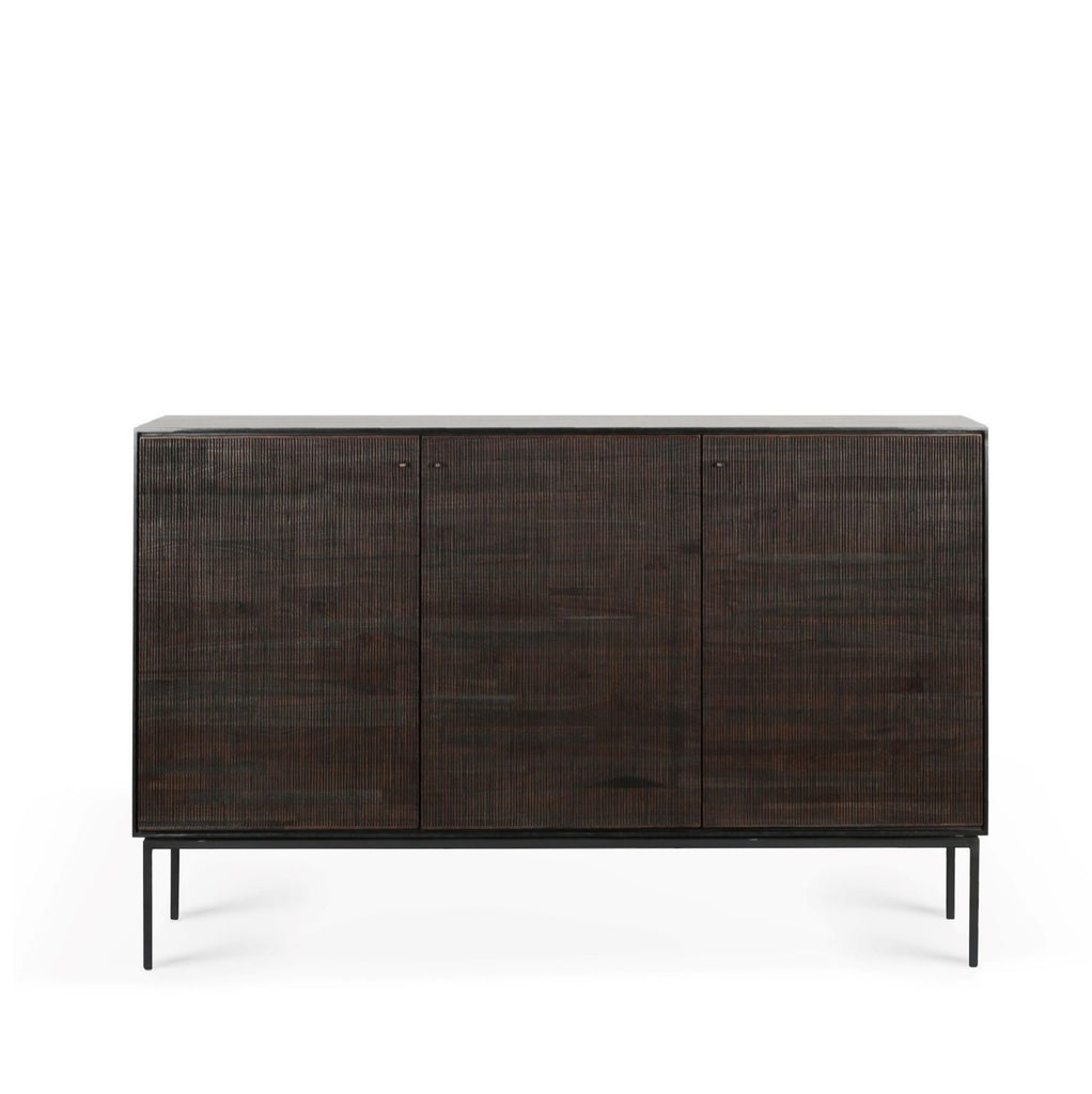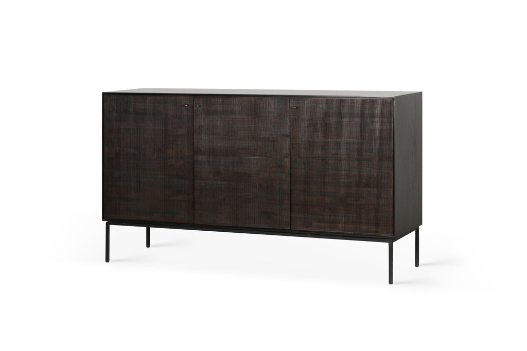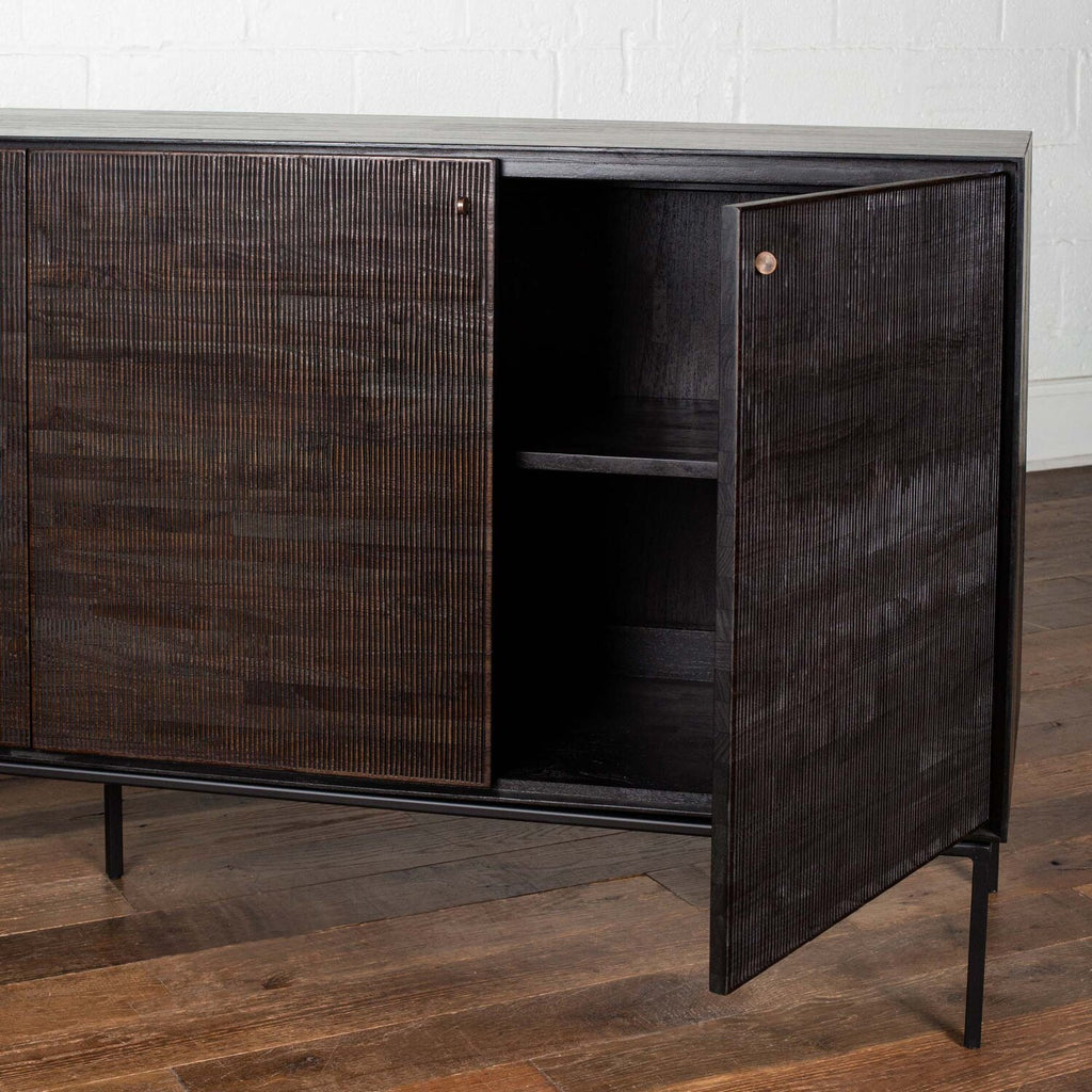 The Grooves sideboard is soulful, to say the least. Every single line you see is hand-carved, making each piece truly unique. Small imperfections are part of the story, even more so: they enhance Grooves' character. The result is a slightly different surface every time, each with its own rhythm and dynamics. The beautiful dark-tinted teak continues on the inside, where shelves and drawers will hold your most cherished objects. This Grooves sideboard features 3 doors. Made from dark-tainted, 100% solid teak with a varnish finish and black metal legs.
