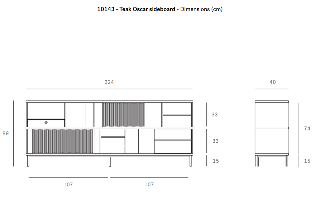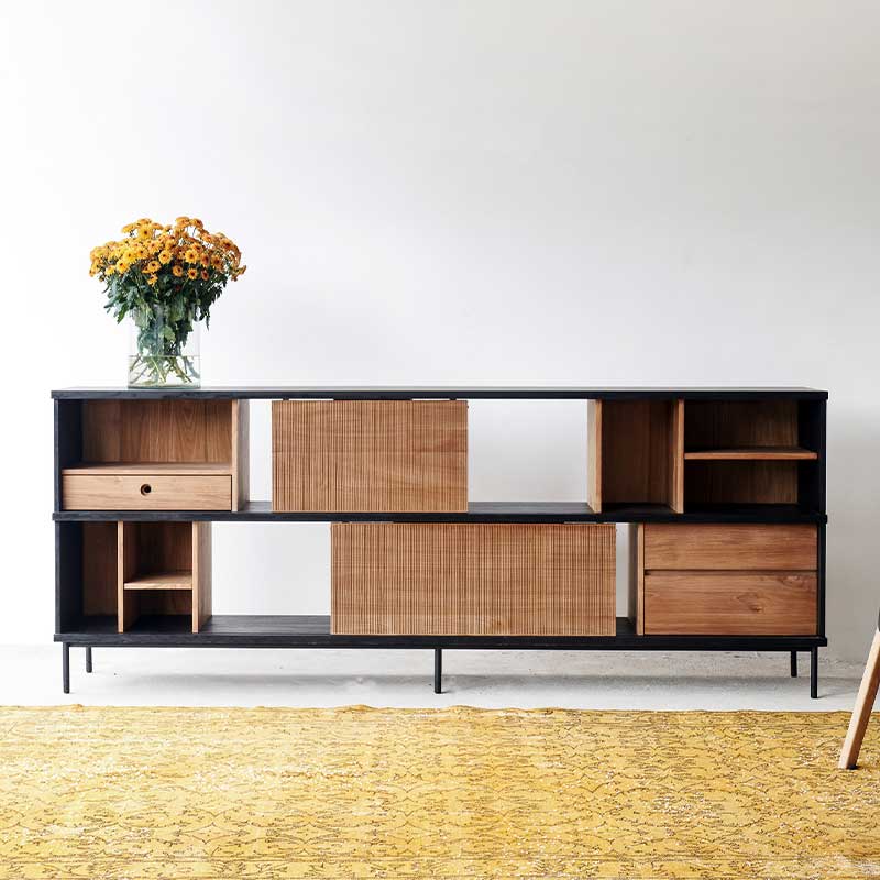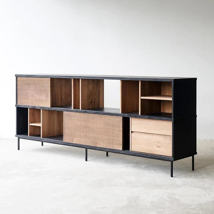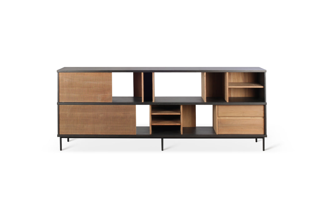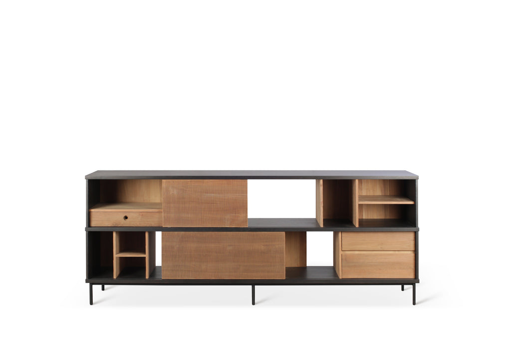 The Oscar sideboard in solid teak by Alain van Havre is the perfect multi-tasker: its open spaces can be used to exhibit personal objects, whereas the sliding doors offer the option of organizing documents out of sight. Notice the exceptional grooves in the doors: each narrow groove was carefully hand carved, making every Oscar piece unique. Features 2 sliding doors and 3 drawers. Made from natural solid teak, black tainted solid teak and black metal legs.