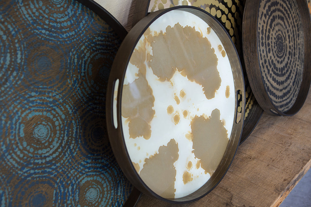 Distinctive and luxurious, the Mystic Gold collection of trays instantly lights up a space with its sunny colours, modern patterns and invigorating bursts of gold. The contrast between its dark wooden rims and bright glass bases further highlights the exquisite tints of gold that are prevalent throughout the collection.