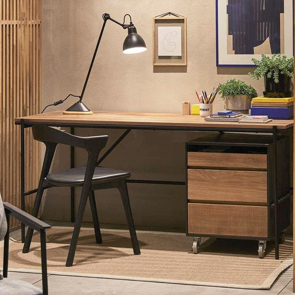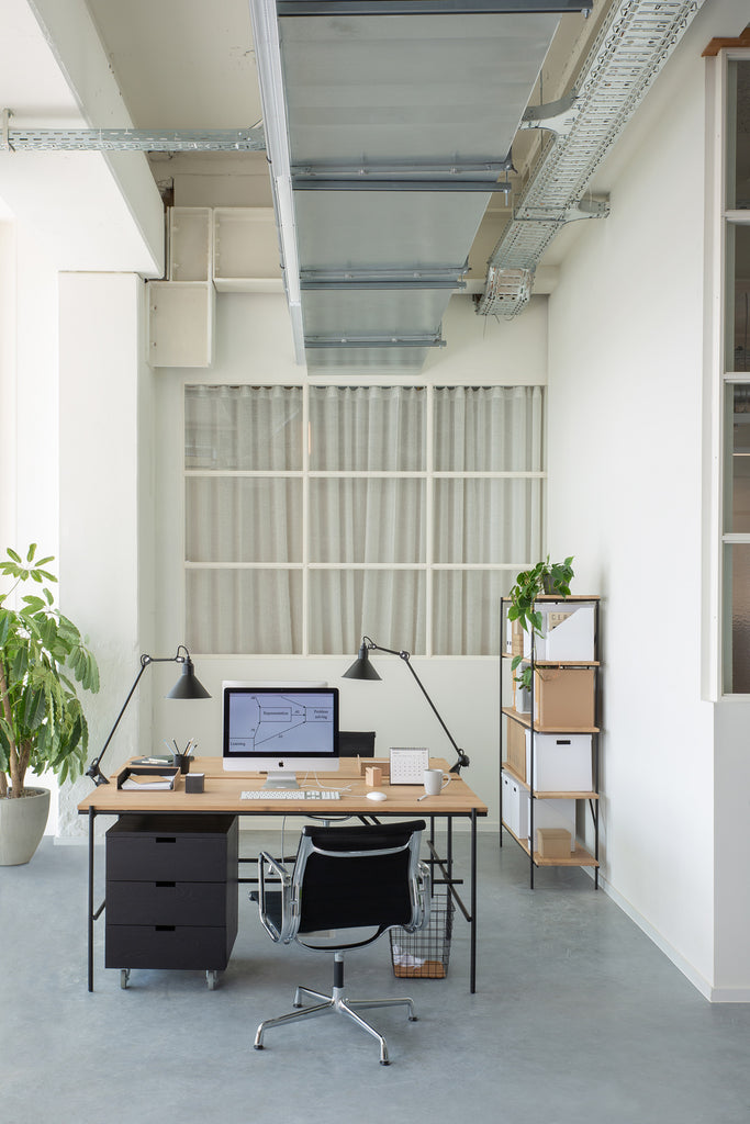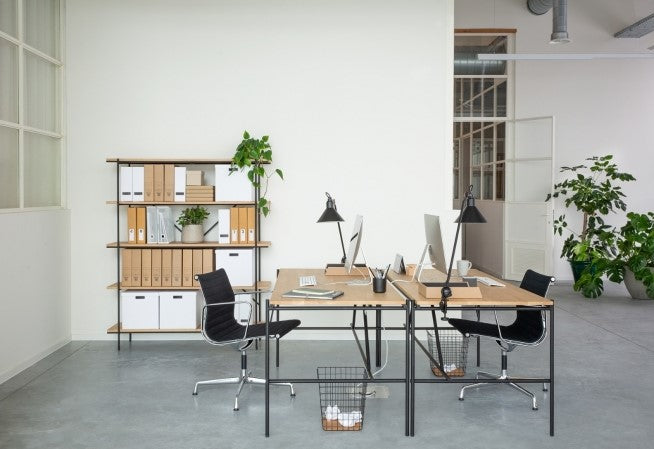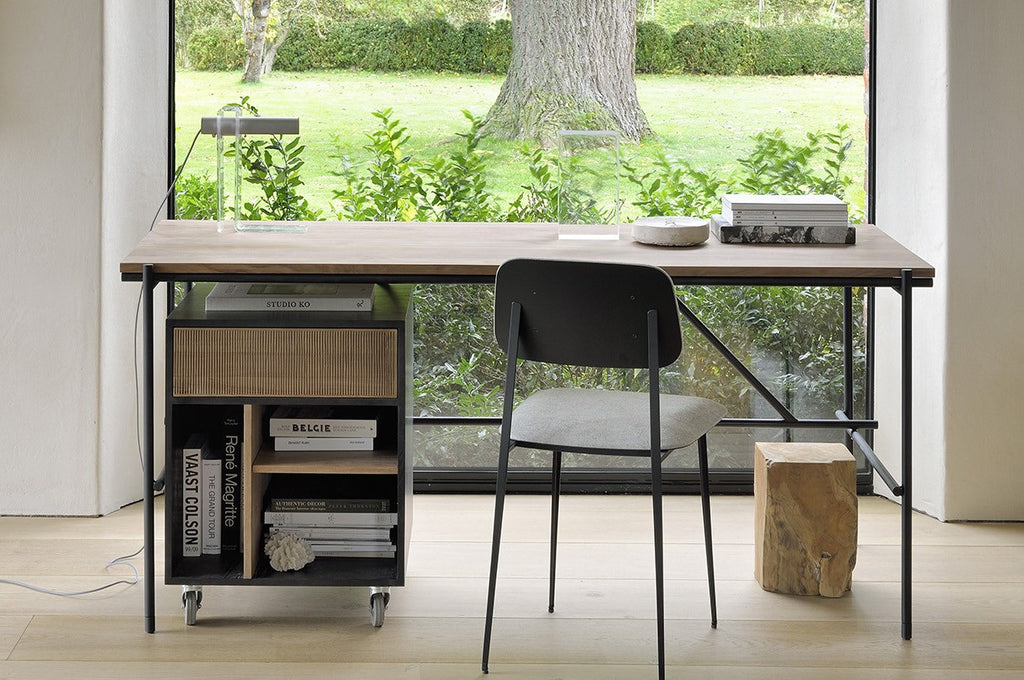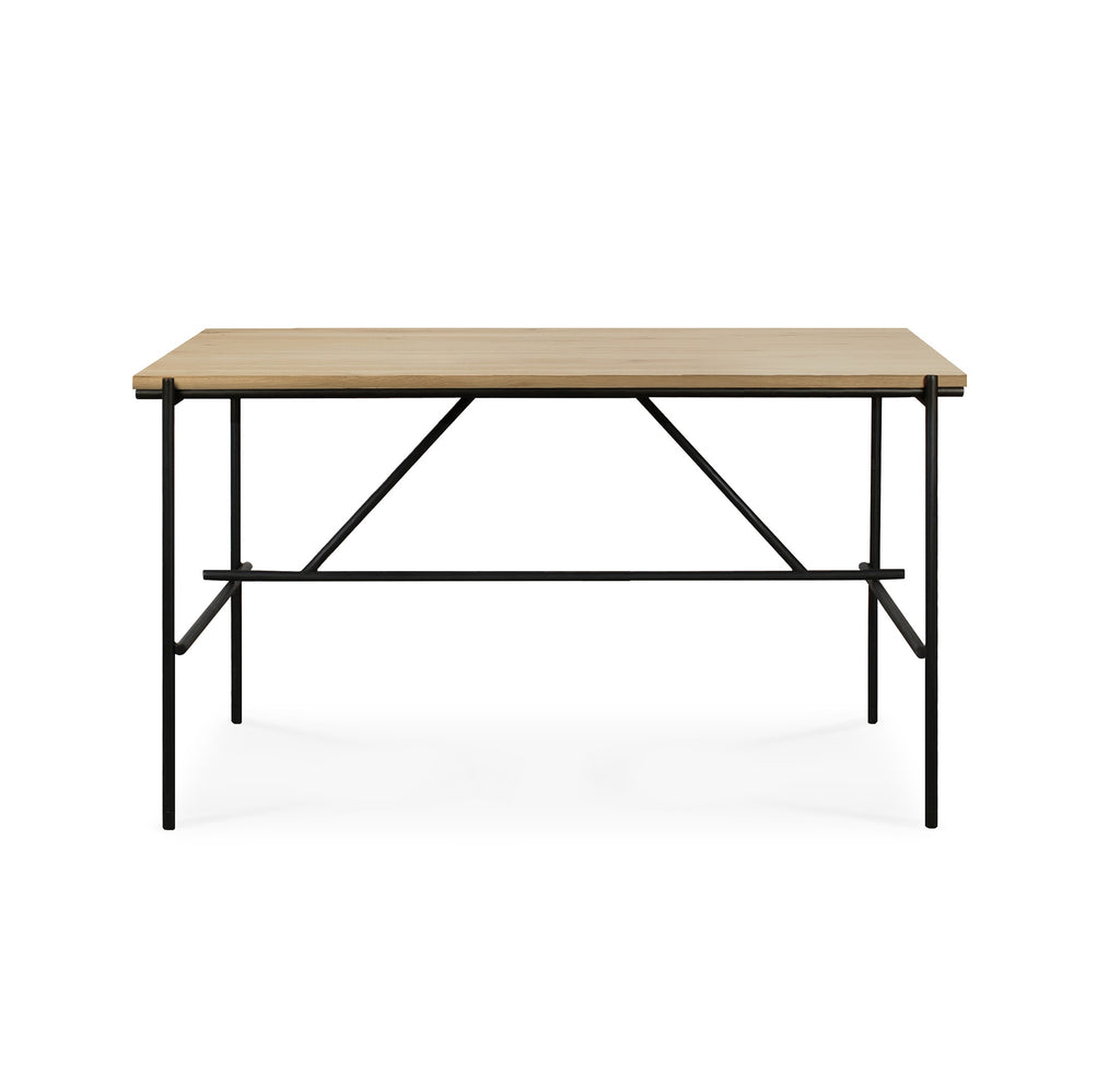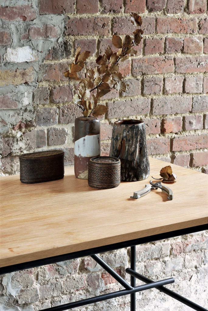 Inspired by minimalistic residential architecture, the light rectangular design is formed by the warmth of oak and metal. Designed by Alain van Havre. Made from solid oak with a varnish finish and black metal legs.