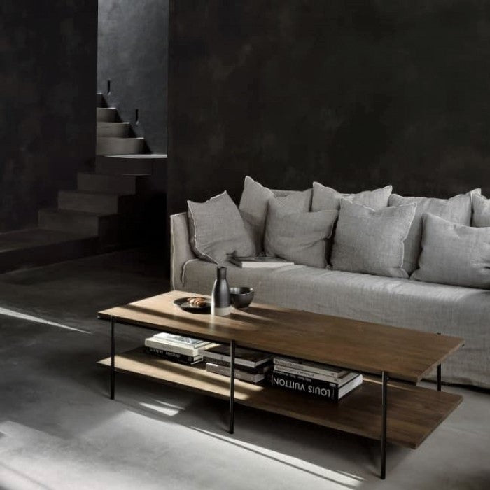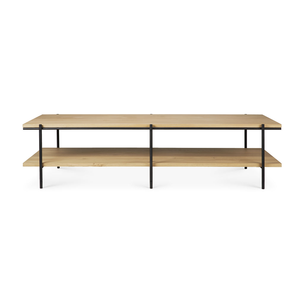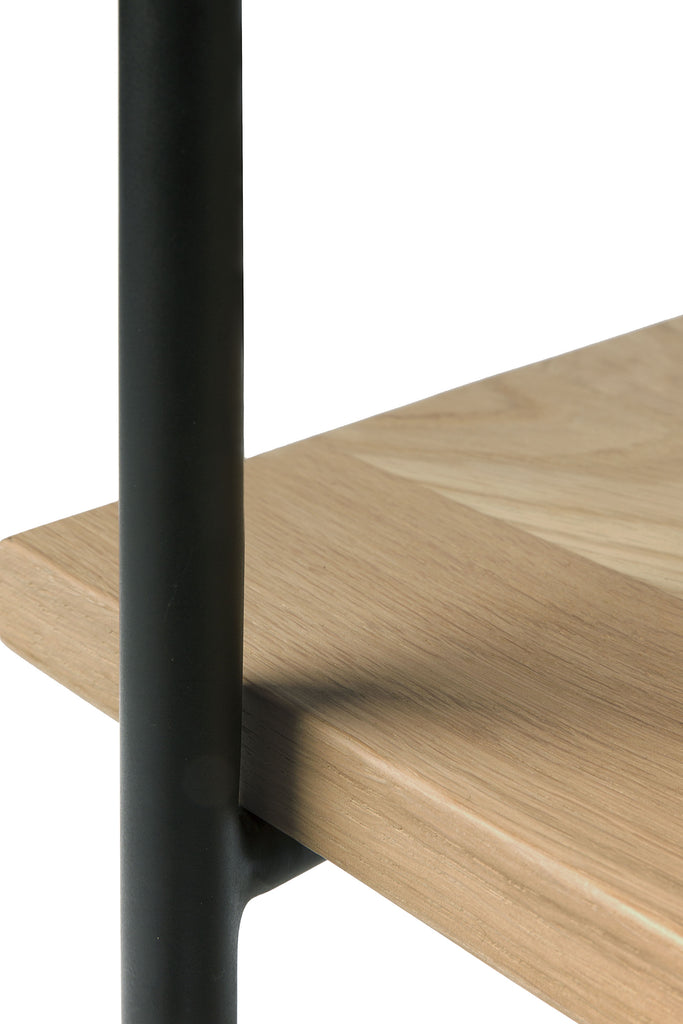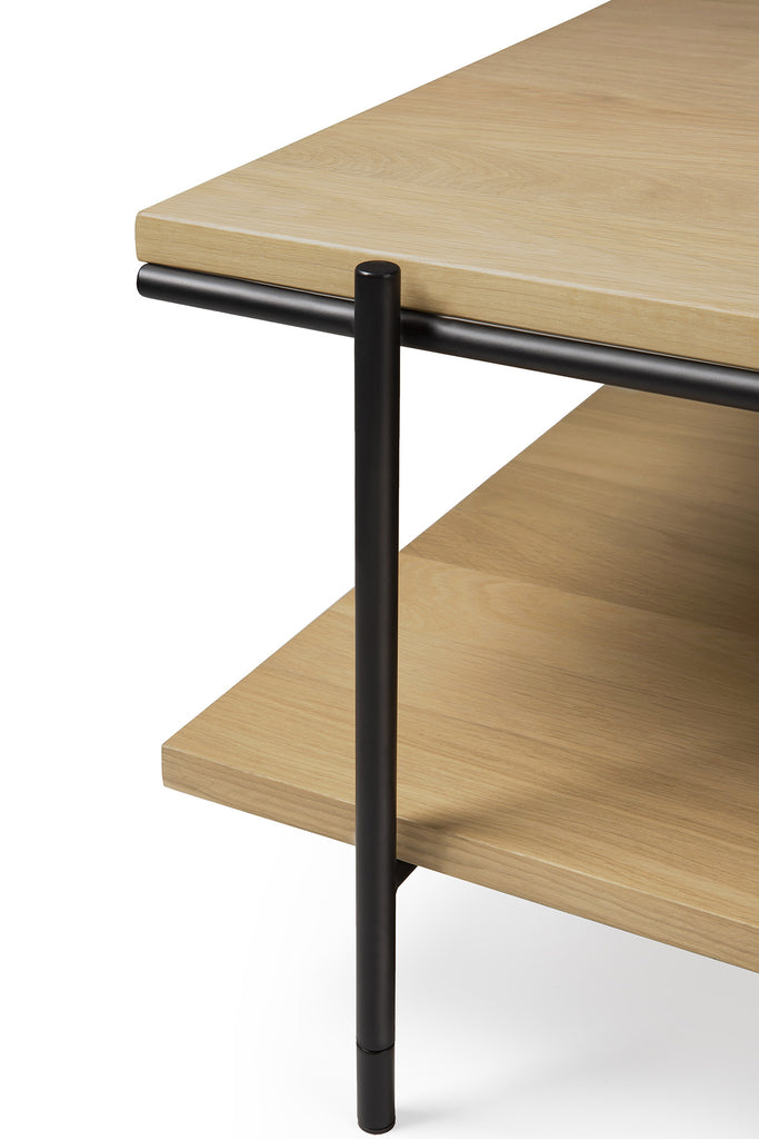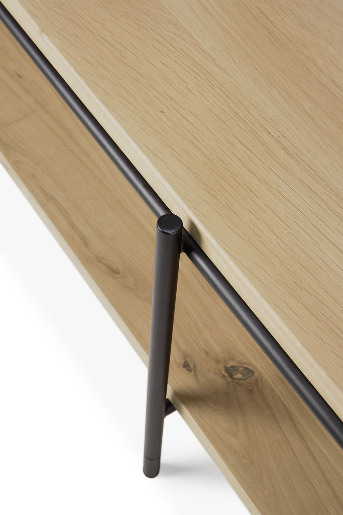 Inspired by minimalistic residential architecture, a light rectangular design is formed by the warmth of oak and metal. Designed by Alain van Havre, the Rise collection’s signature openness offers ample space to display decorative objects, without drawing attention from the setting you create. Made from solid oak with a varnish finish, and black metal legs.