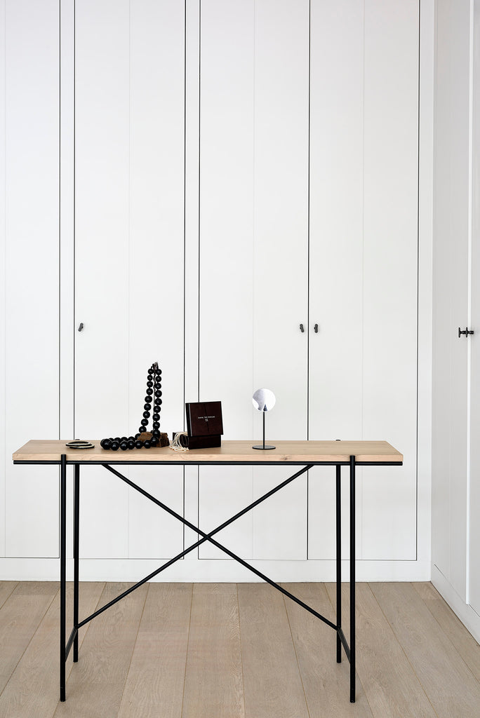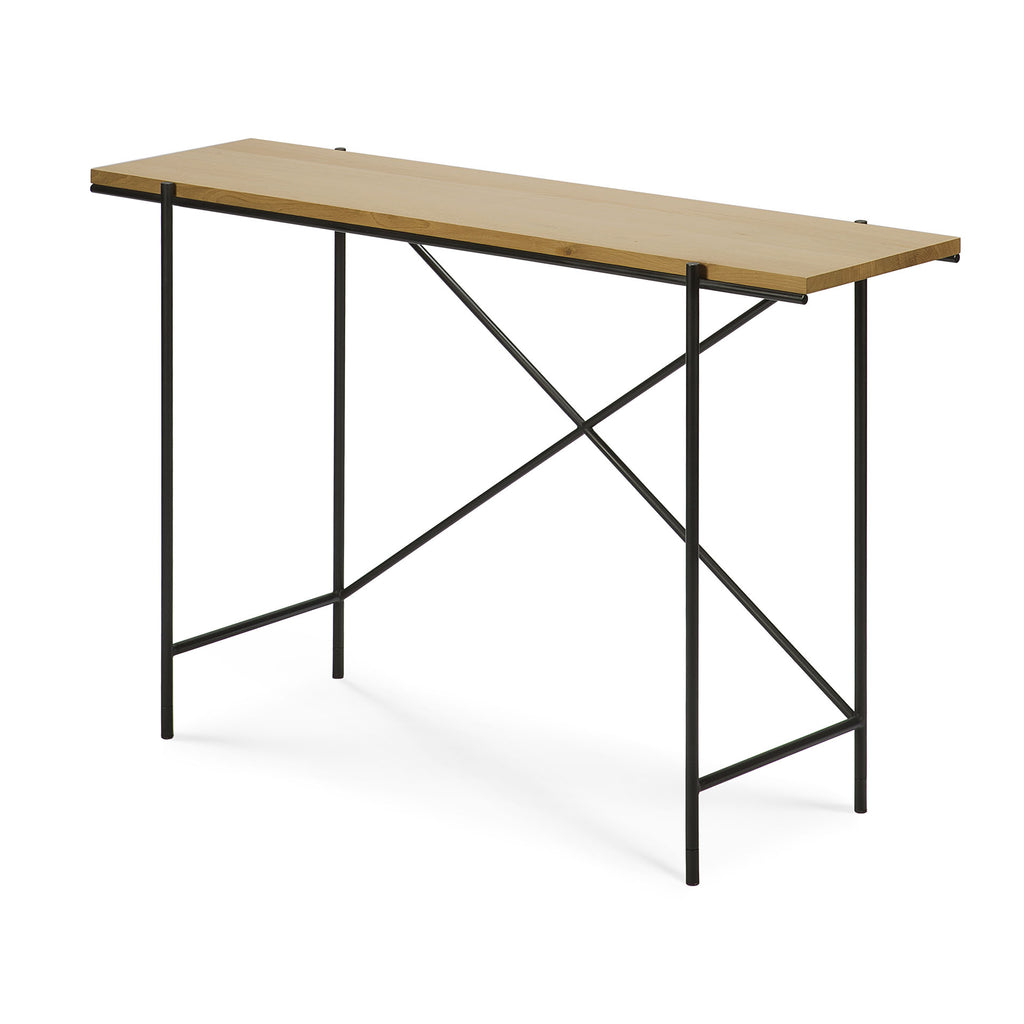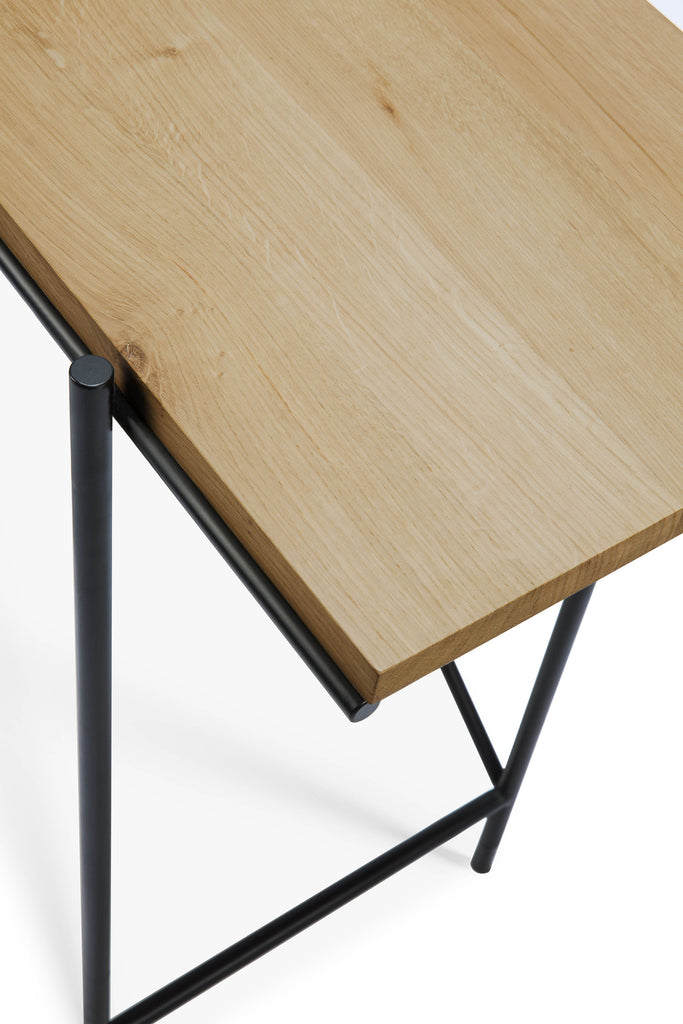 Inspired by minimalistic residential architecture, a light rectangular design is formed by the warmth of oak and metal. Designed by Alain van Havre, the Rise collection’s signature openness offers ample space to display decorative objects, without drawing attention from the setting you create. Made from solid oak with a varnish finish, and black metal legs.