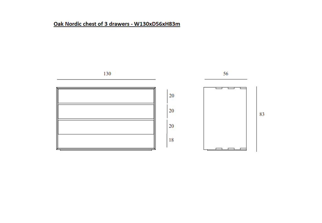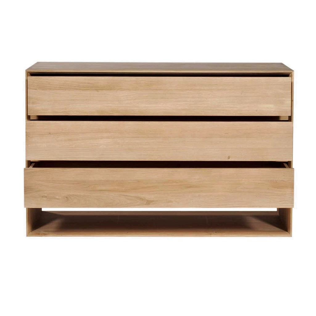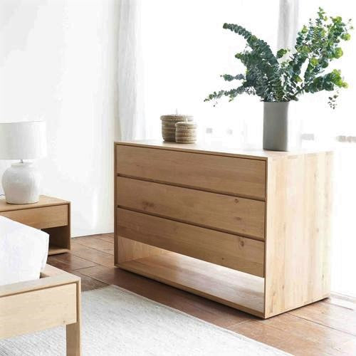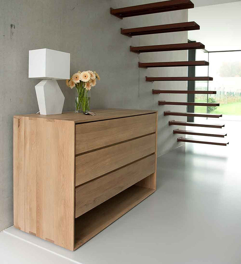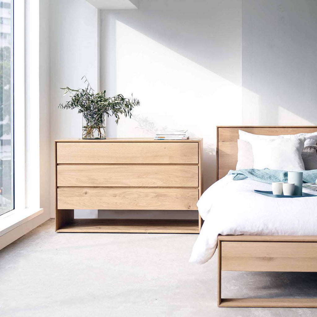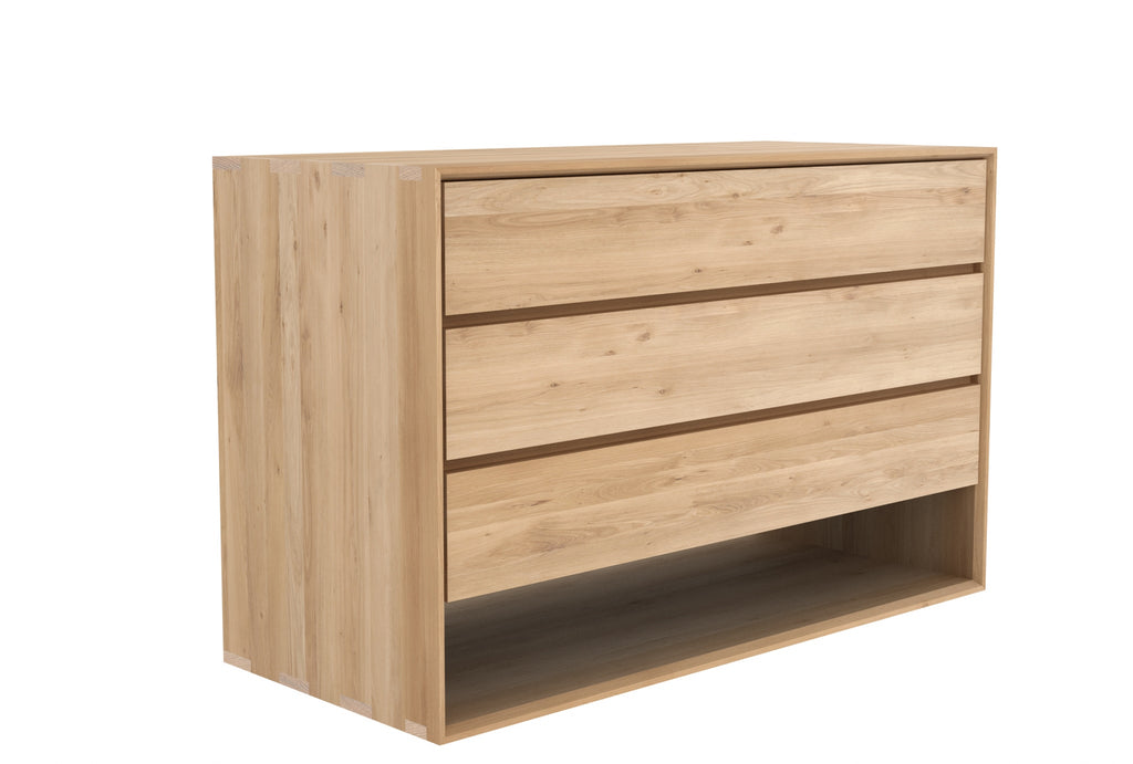 Our Nordic collection combines refined design with the purity of solid wood. The beveled edges gives this solid oak chest of drawers an extra edge, we would say. This chest of drawers is made from solid oak and features three drawers. Made from solid oak, with a hard-wax oil finish.