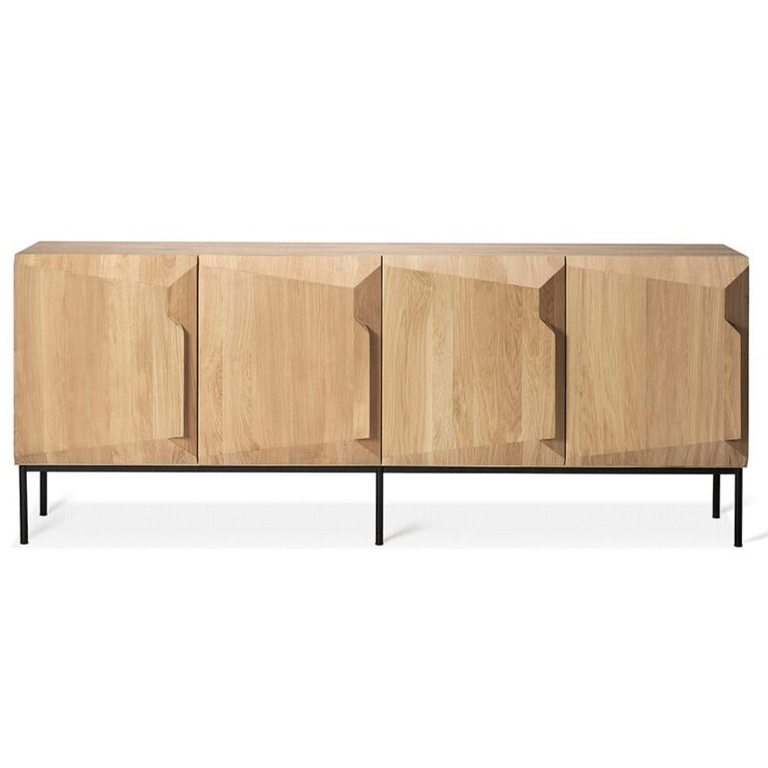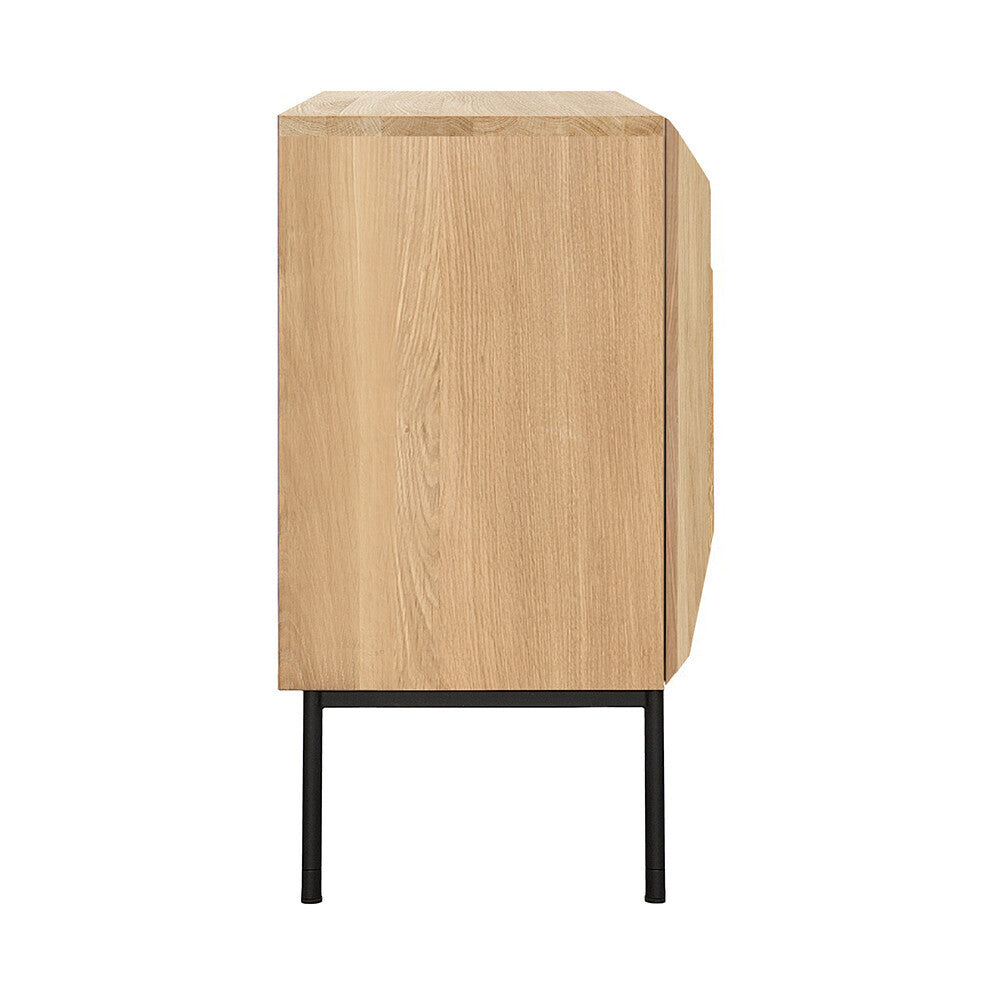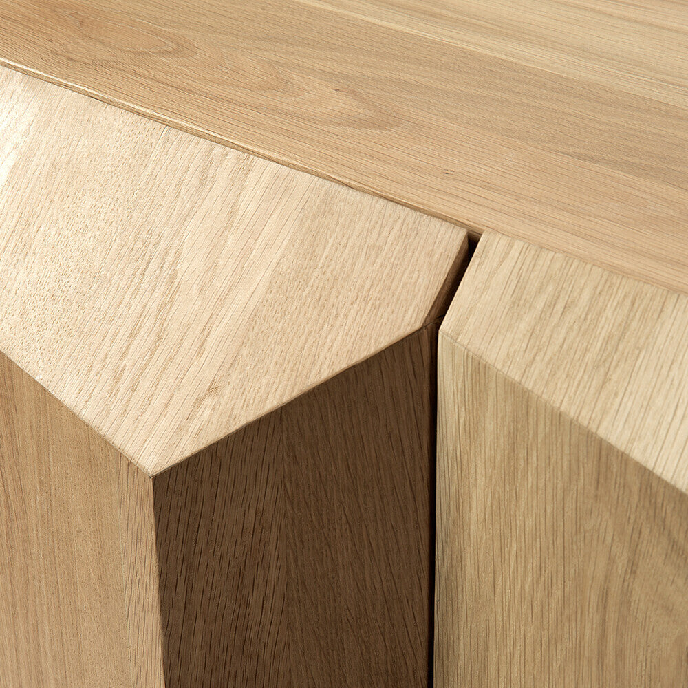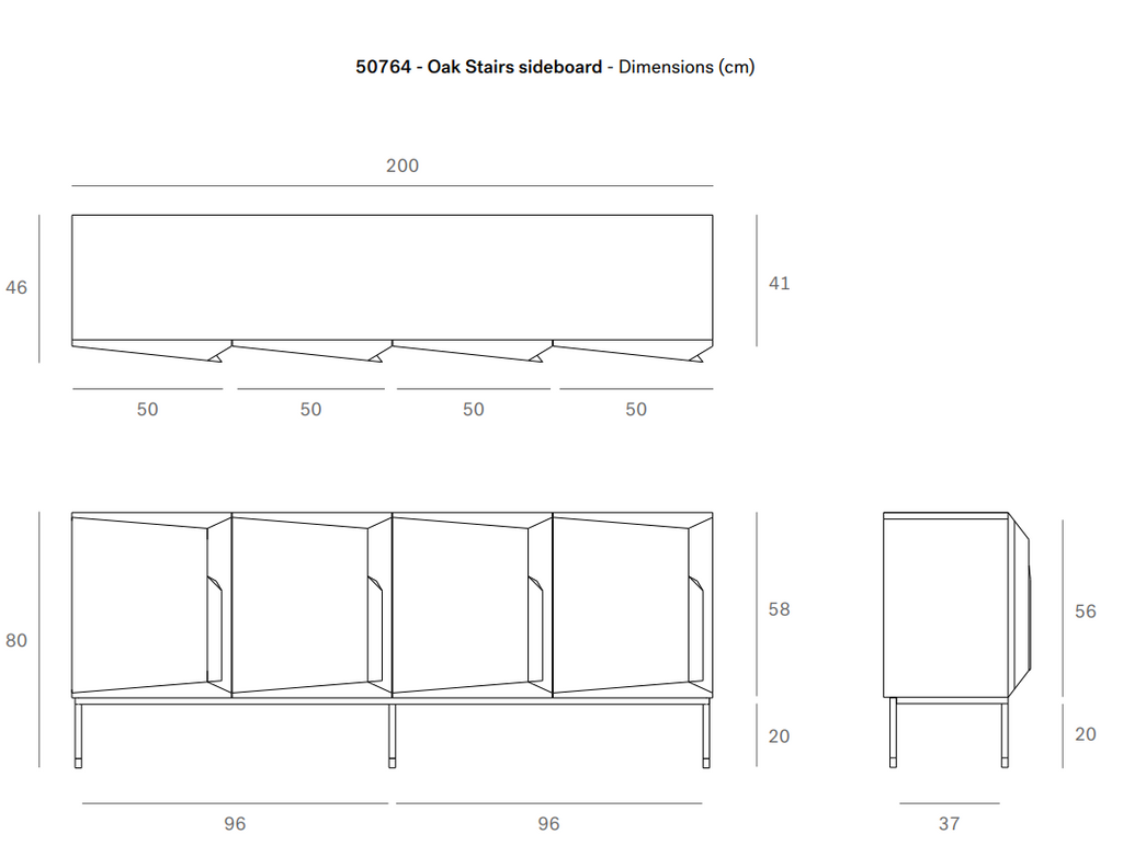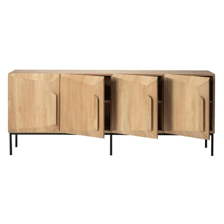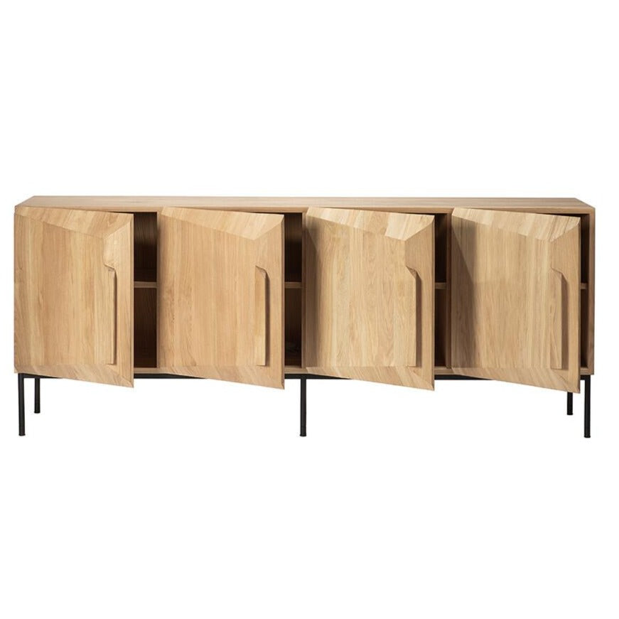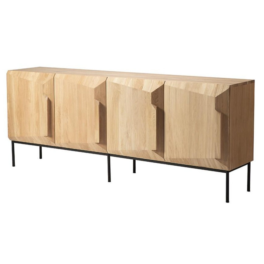This Stairs sideboard features 4 doors. An angular composition, designed by Alain van Havre, forms the heart of a design that aims to distance itself from traditional static and immobile surfaces. A unique sense of volume is created which alters your perception of the sideboard in solid oak as you walk by. Made from solid oak with a varnish finish and black metal legs.