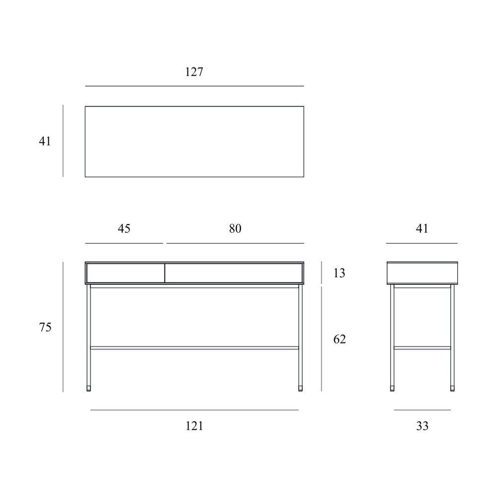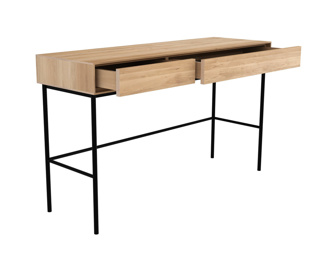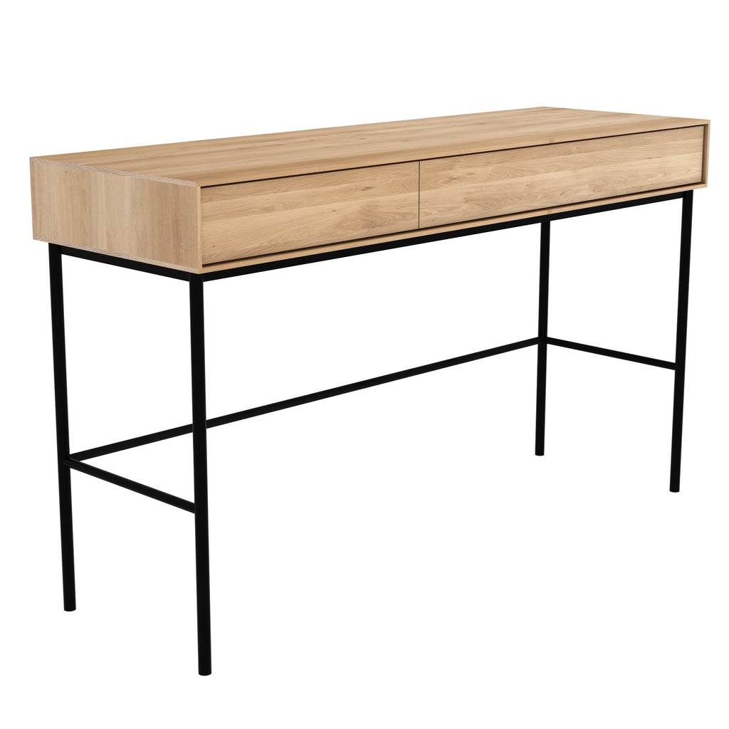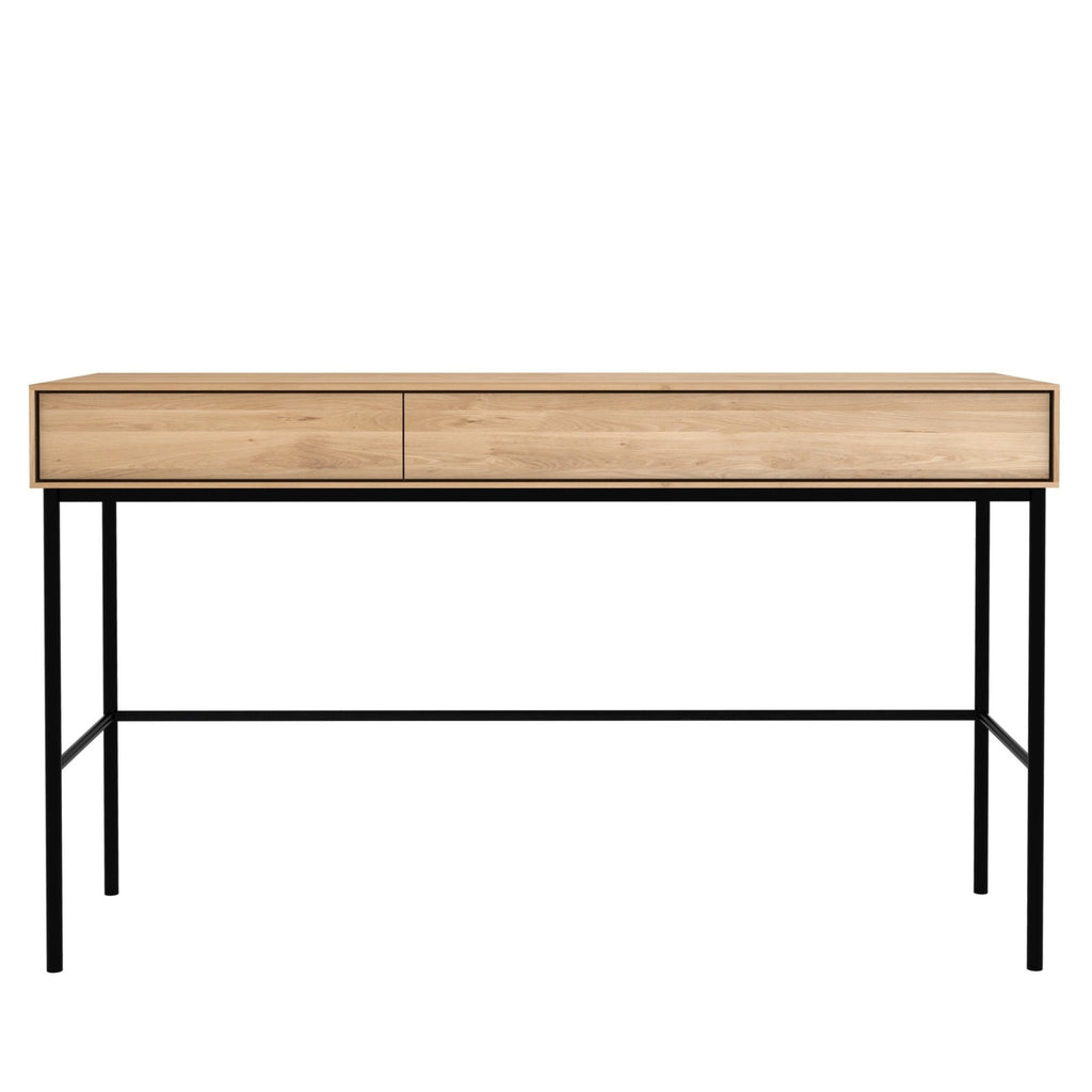 The Whitebird desk features 2 push open drawers. For the Whitebird collection, designer Alain van Havre brings together opposing elements, combining soft round legs and eye-catching graphic lines into light and airy designs. Made from solid oak with a varnish finish and black metal legs.