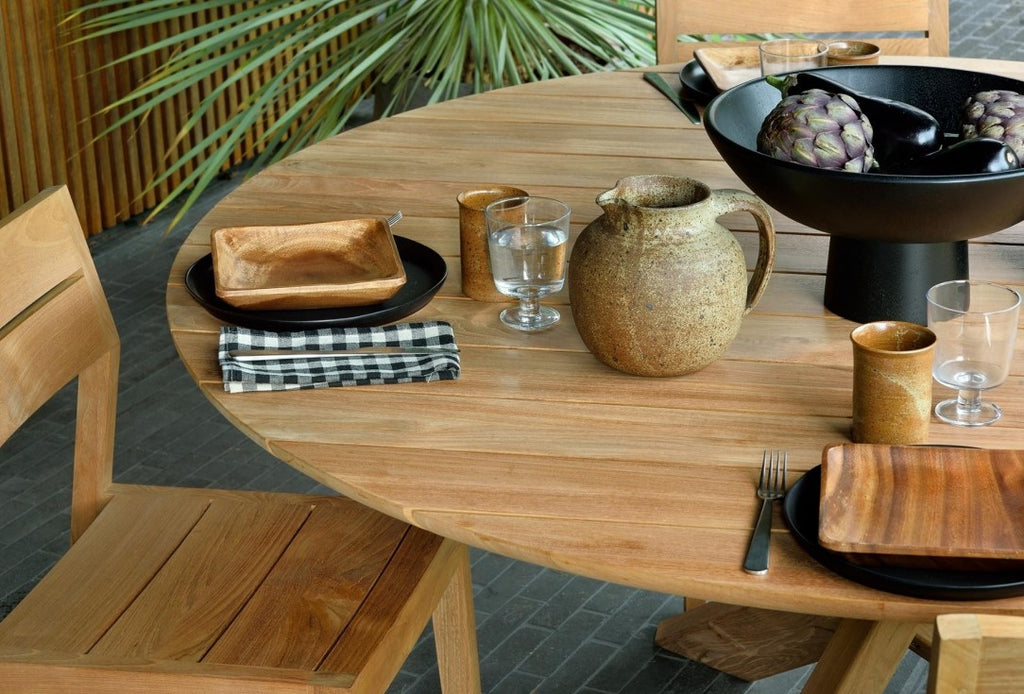 Ethnicraft's Teak Circle dining table is all about inspiring your loved ones to spend a little more time at the table. Its solid legs intertwine in perfect balance, while the adapted grooved design makes outdoor life a simple pleasure. This product is made using sustainable and responsible Teak wood and is FSC certified.