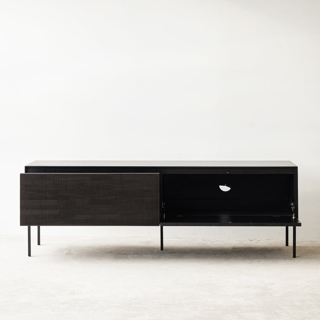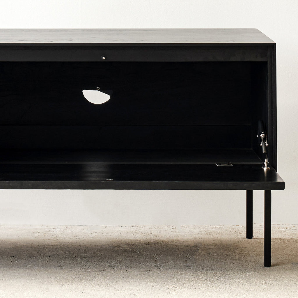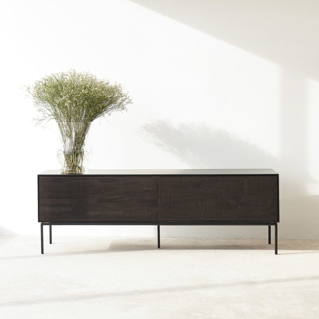 The Grooves TV cupboard in solid teak is soulful to say the least. Every single line you see is hand carved, making each piece truly unique. Small imperfections are part of the story, even more so: they enhance Grooves' character. The result is a slightly different surface every time, each with its own rhythm and dynamics. The beautiful dark tinted teak continues on the inside, where shelves and drawers will hold your most cherished objects. This Grooves TV cupboard features 1 flip-down door and 1 drawer. Made from dark-tainted solid teak with a varnish finish and black metal legs.