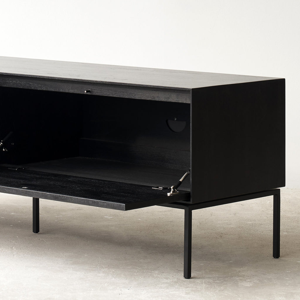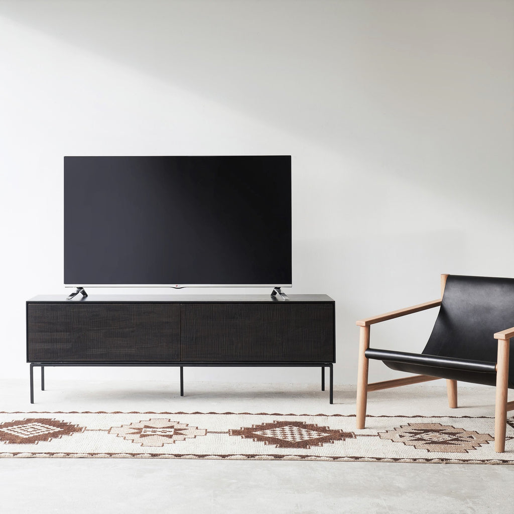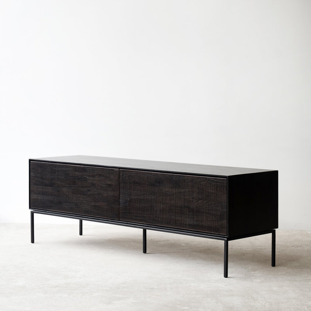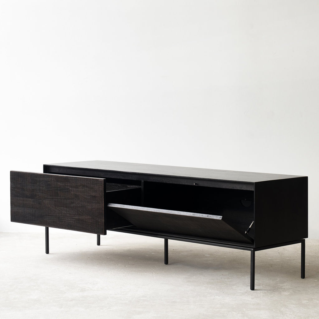 The Grooves TV cupboard in solid teak is soulful to say the least. Every single line you see is hand carved, making each piece truly unique. Small imperfections are part of the story, even more so: they enhance Grooves' character. The result is a slightly different surface every time, each with its own rhythm and dynamics. The beautiful dark tinted teak continues on the inside, where shelves and drawers will hold your most cherished objects. This Grooves TV cupboard features 1 flip-down door and 1 drawer. Made from dark-tainted solid teak with a varnish finish and black metal legs.