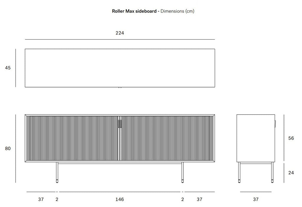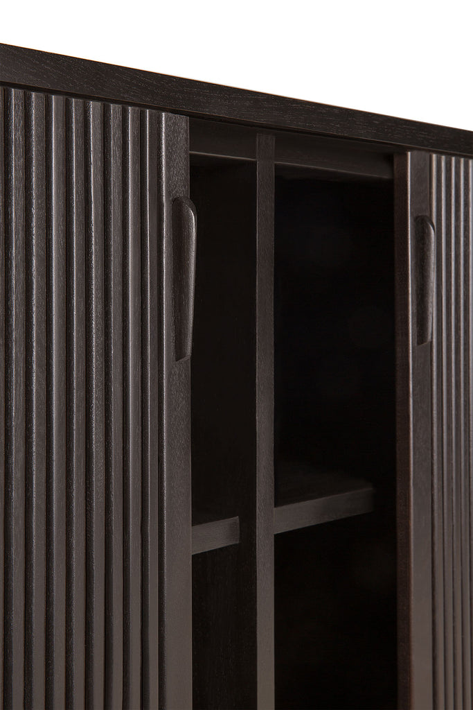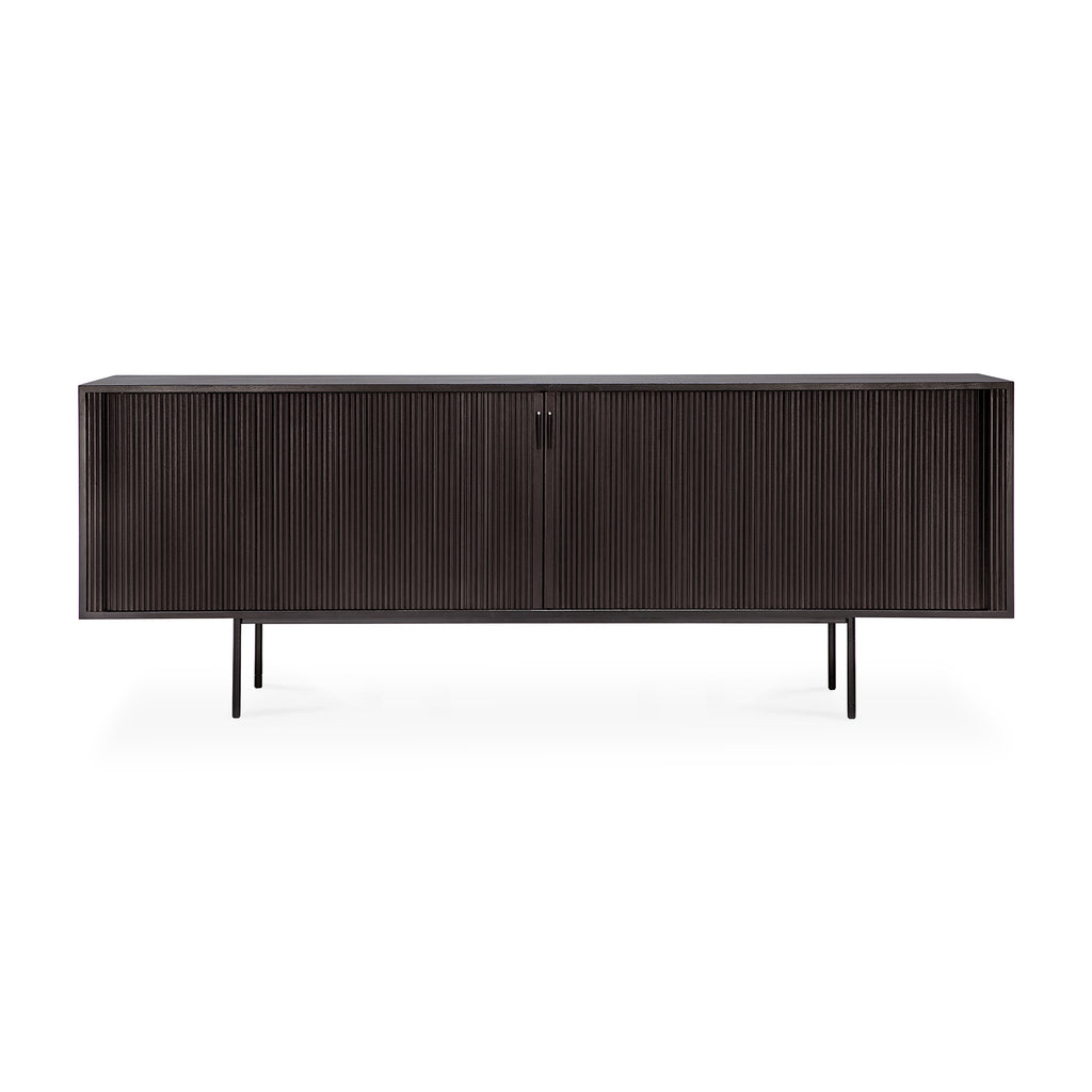 The Roller Max sideboard offers functional storage in an eye-catching design. Featuring sliding doors, adjustable shelving and seamlessly integrated handles, this piece beautifully showcases the collection's stacked wood-stick design. The result is an elegant and sophisticated item for both residential and commercial spaces. Designed by Alain van Havre. This Roller Max sideboard features 2 fully-opening sliding doors and adjustable shelves. Mahogany doors with a varnish finish, teak body and legs with a varnish finish. Made of 100% solid & sustainably harvested plantation timbers.