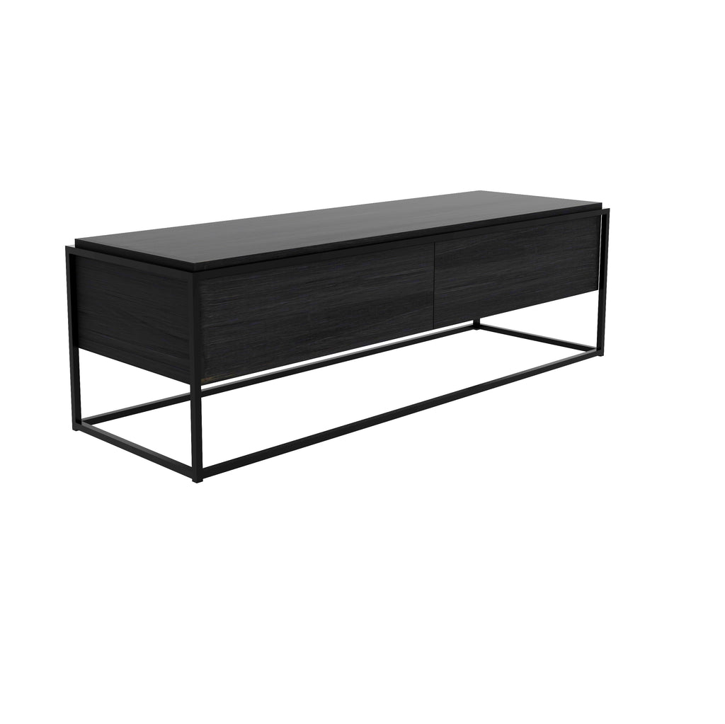 The Monolit TV cupboard features 1 push open drawer and 1 flip-down door. Balance and function come together in the Monolit TV cupboard. It attracts attention without diverting it from the object you choose to display. Made from black tainted solid oak with a varnish finish and a black metal frame.