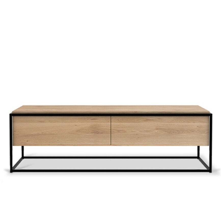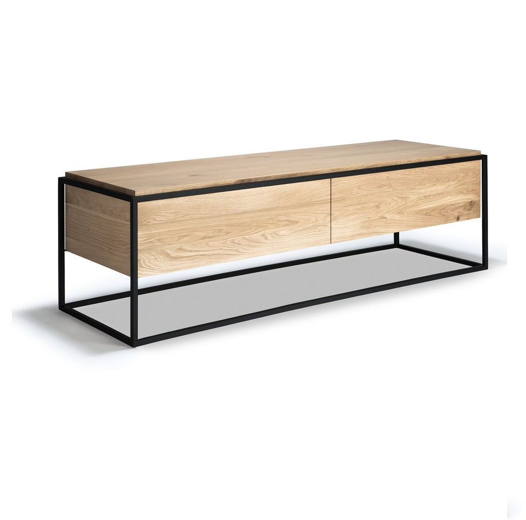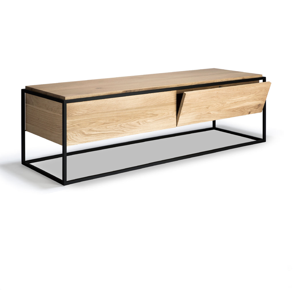 The Monolit TV cupboard features 1 push open drawer and 1 flip-down door. Balance and function come together in the Monolit TV cupboard. It attracts attention without diverting it from the object you choose to display. Made from solid oak with a hard-wax oil finish and a black metal frame.