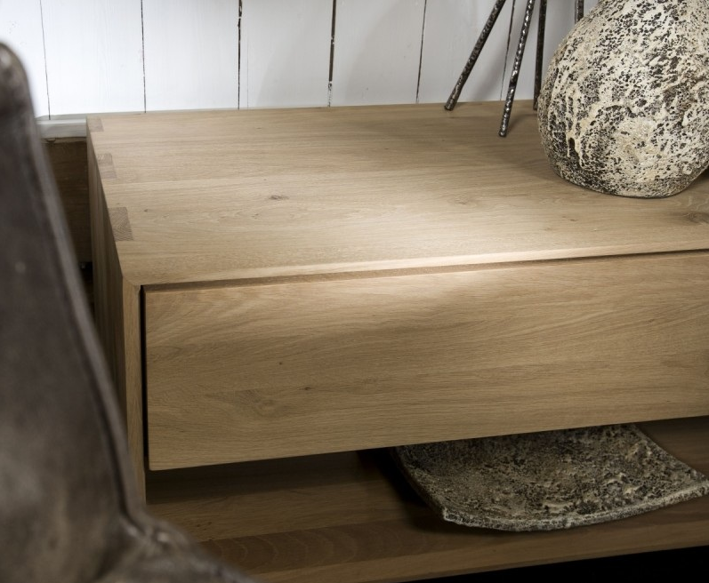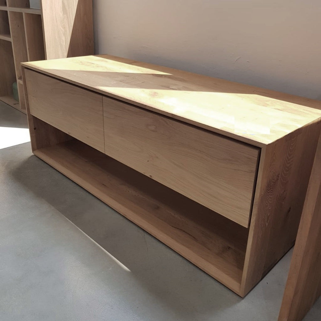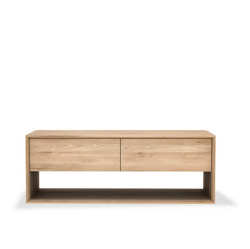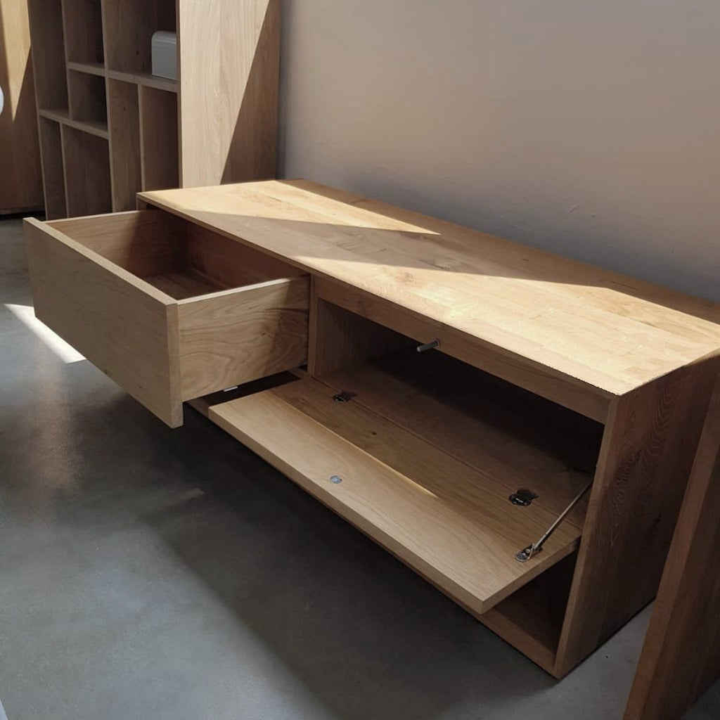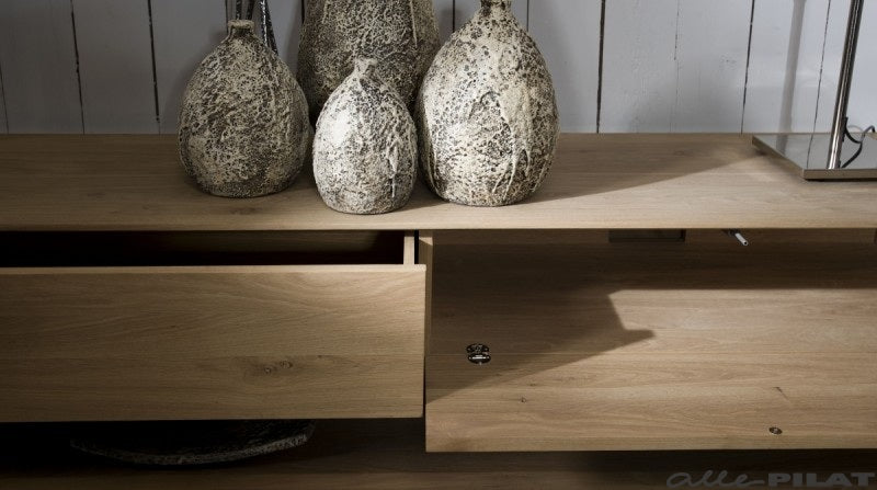 The oak Nordic TV cupboard features 1 flip-down door and 1 soft-closing drawer. The Nordic collection combines refined design with the purity of solid wood. The beveled edges gives this solid oak cupboard an extra edge. Made from solid oak with a hard-wax oil finish.