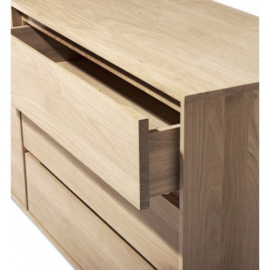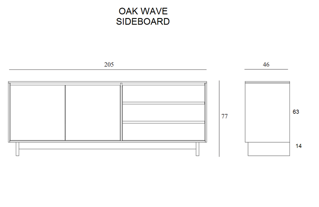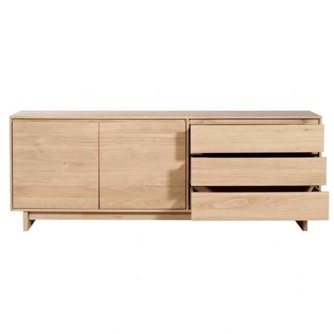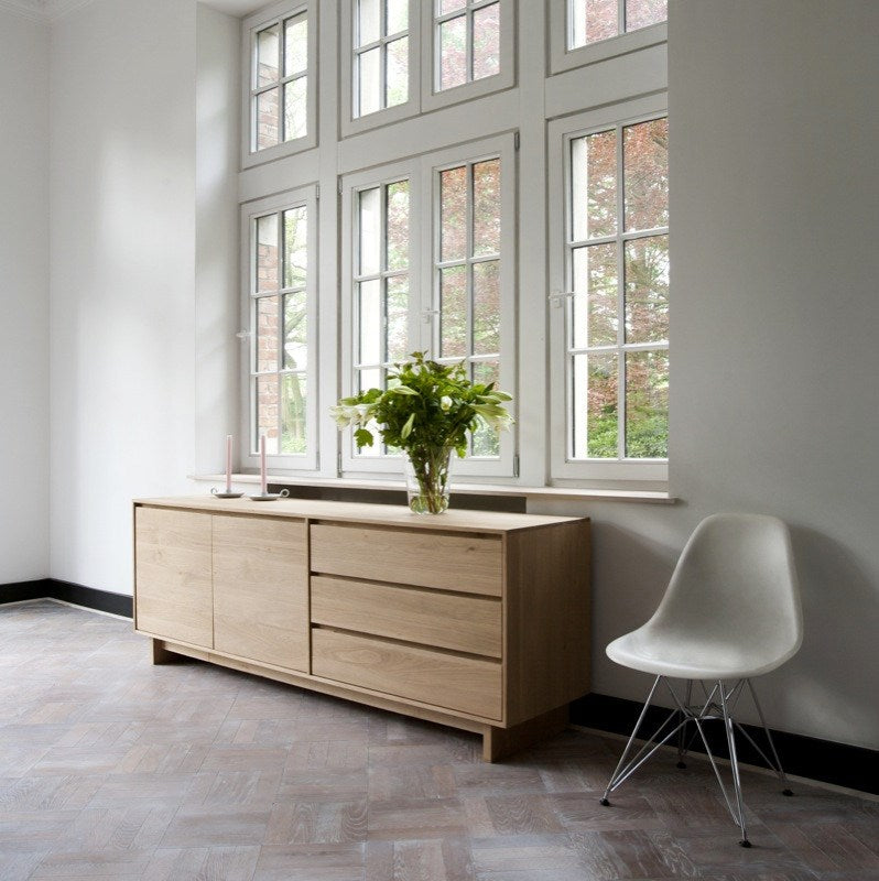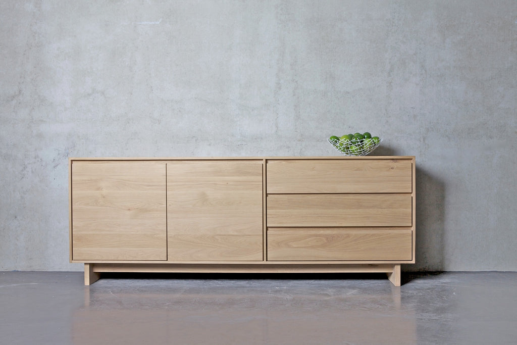 This Wave sideboard features 2 doors and 3 drawers. The subtle contours of the cabinet doors and the distinguished shape of the feet are what make the Wave sideboard in oak so special. Made of solid wood, this sideboard’s doors and drawers have no handles and feature a soft closing mechanism. Made from solid oak with a hard-wax oil finish.