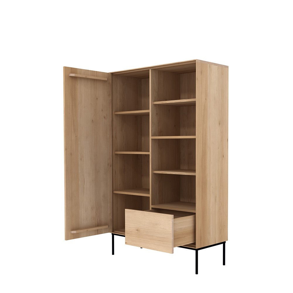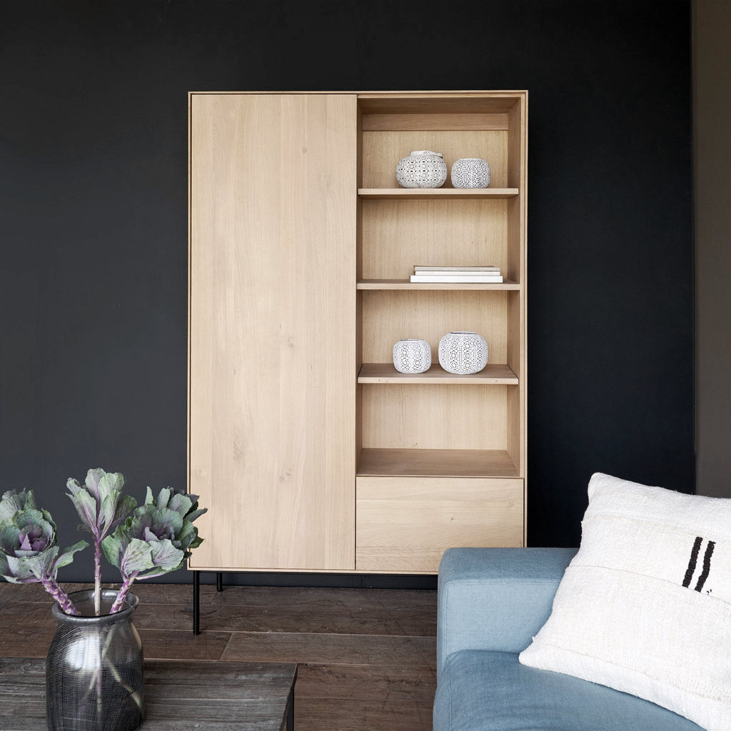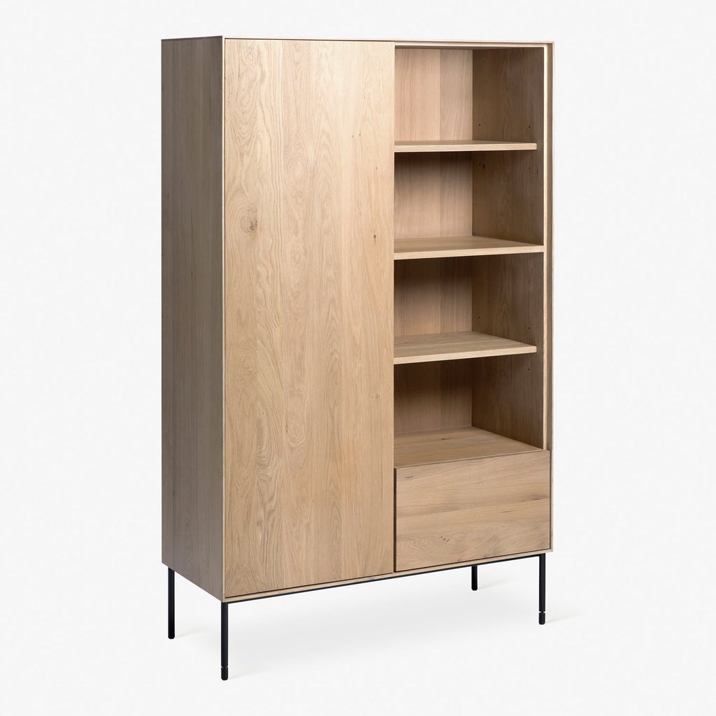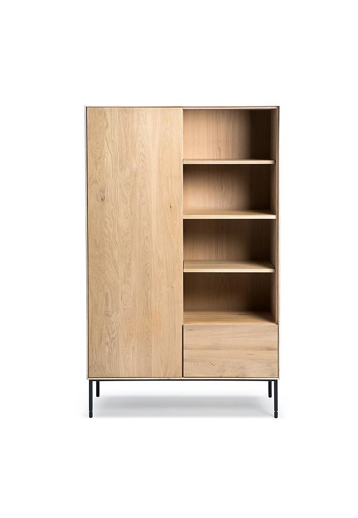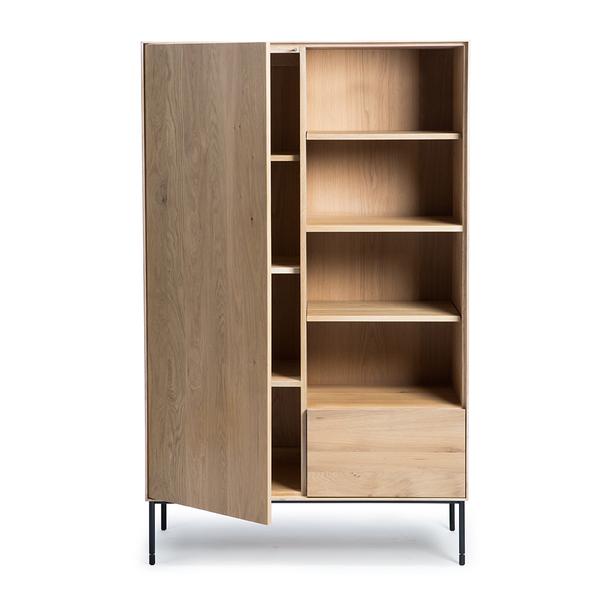The Whitebird storage cupboard features 1 push open door and 1 push open drawer. For the Whitebird collection, designer Alain van Havre brings together opposing elements, combining soft round legs and eye-catching graphic lines into light and airy designs. Made from solid oak with a varnish finish and black metal legs.