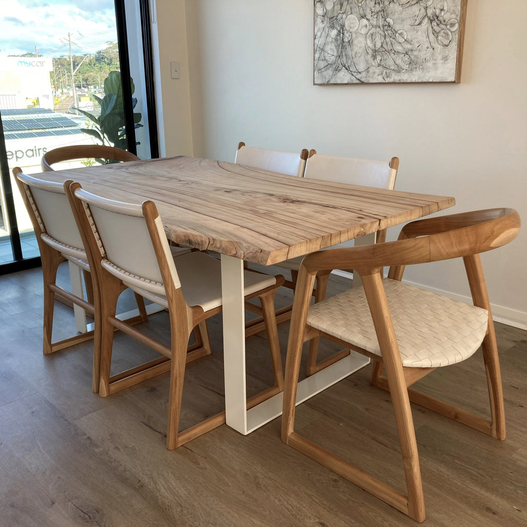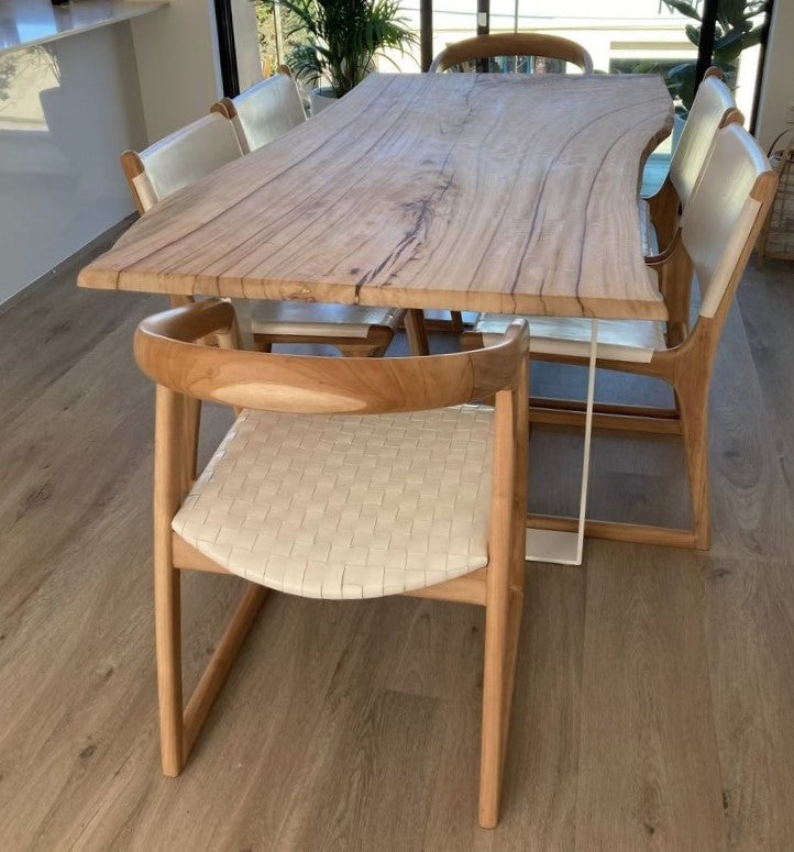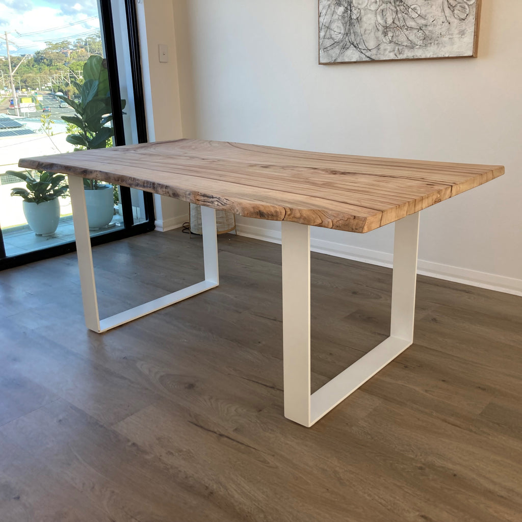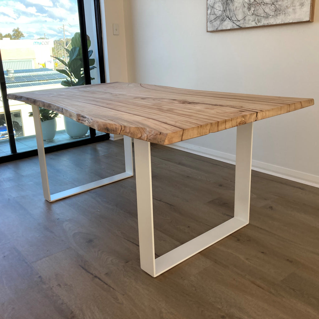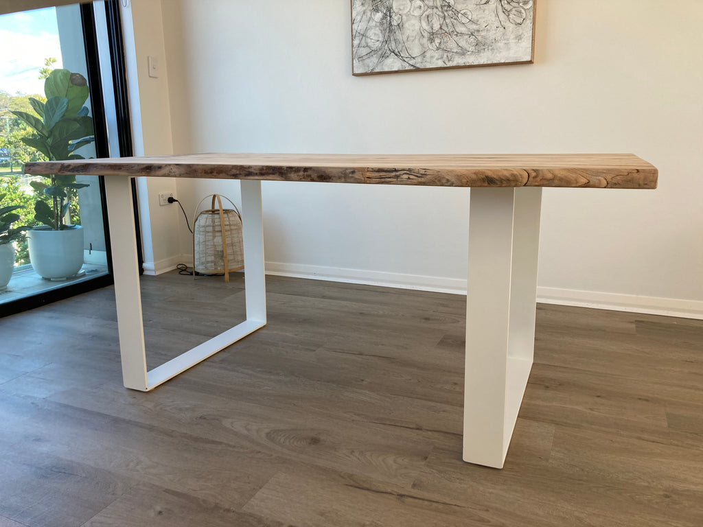The full slab Camphor Laurel live edge table with solid steel hoop legs is a sturdy combination of the rawness of nature and the sleekness of the steel frame. Camphor Laurel is a local hardwood is categorized as a weed, comes with a fresh camphor smell (when sealed with penetrative sealers) when creating a raw natural feel/look. Comes in a variety of sizes and shapes - every table is unique - steel frames are made in Australia. We can select slabs to preferred sizes, a variety of protective finishes is available.